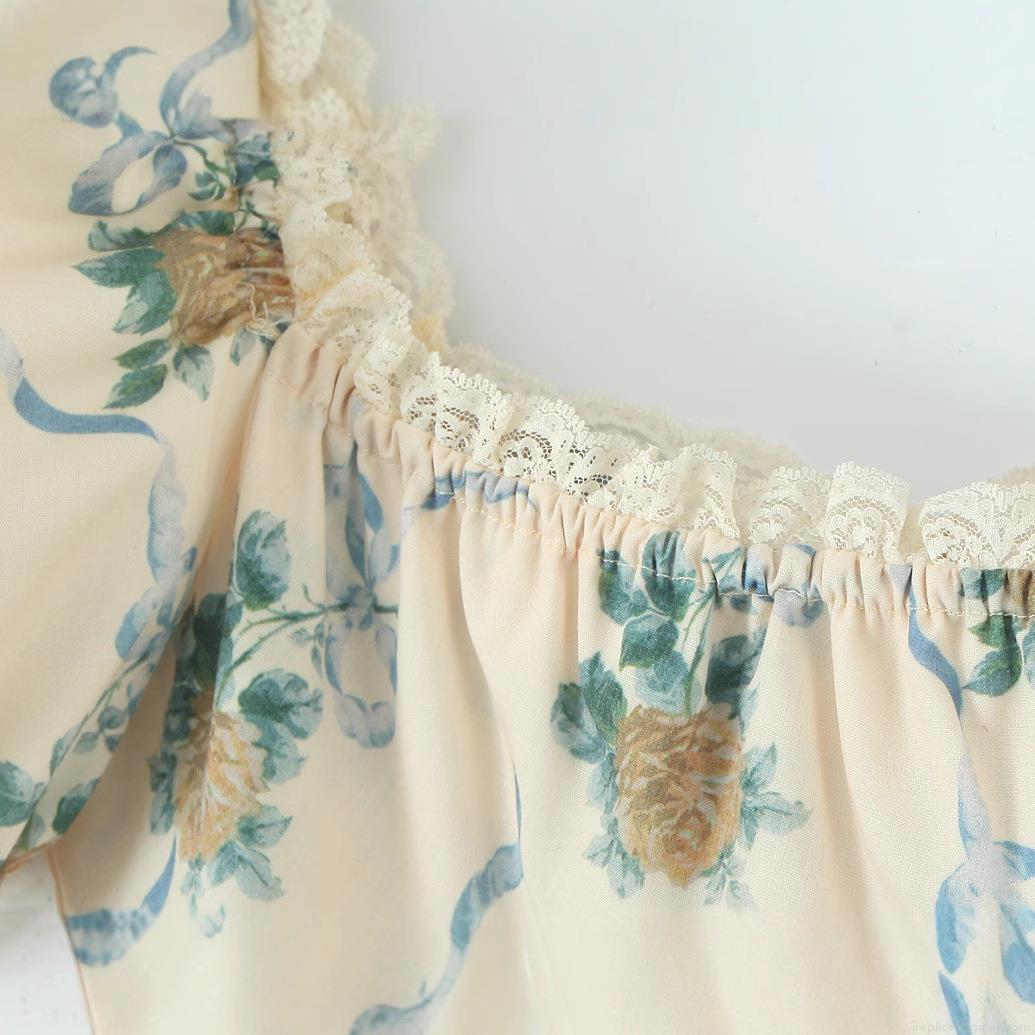 Rose, Lace Trim, Gathering, Puff Sleeves, Square Collar, Ribbon Print