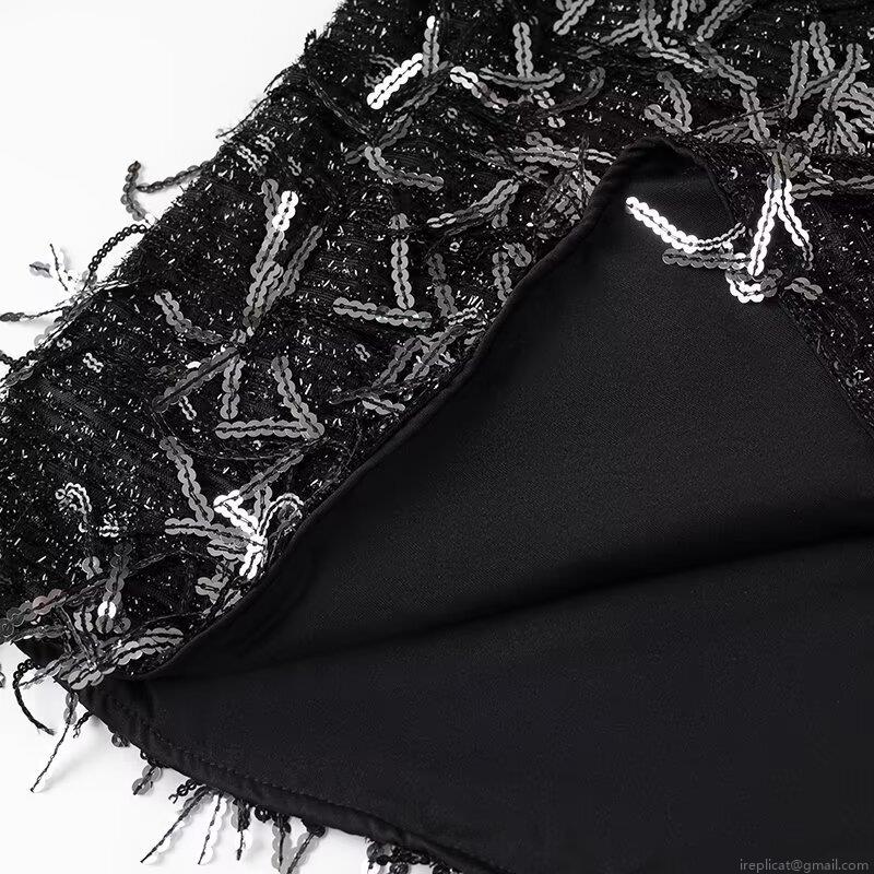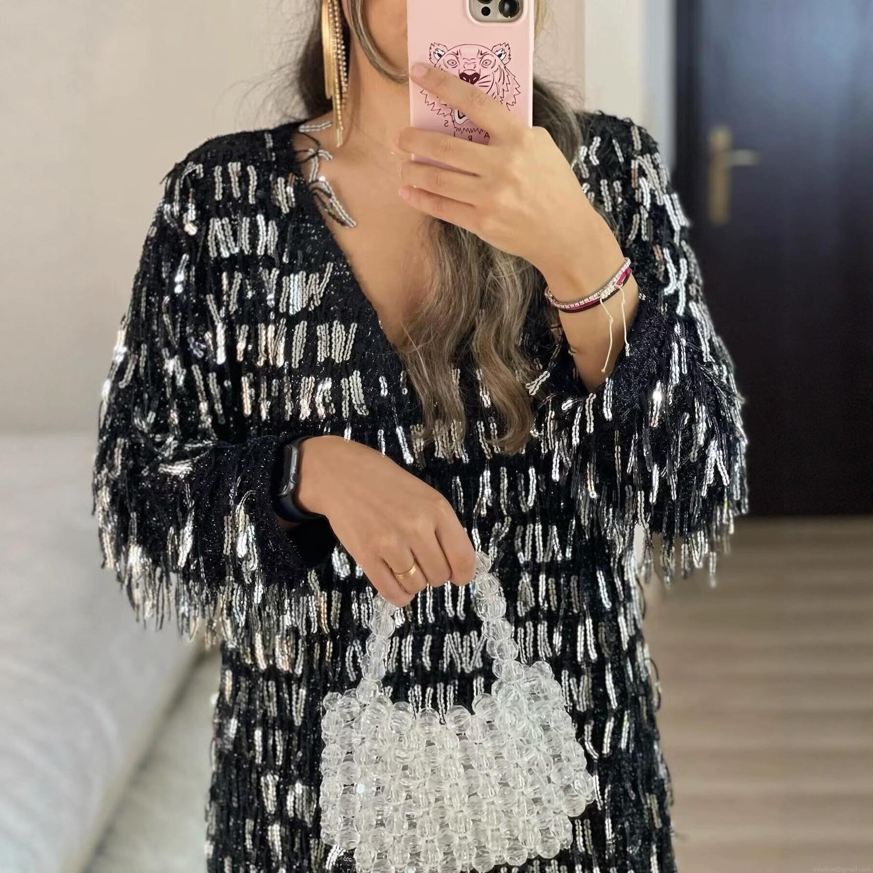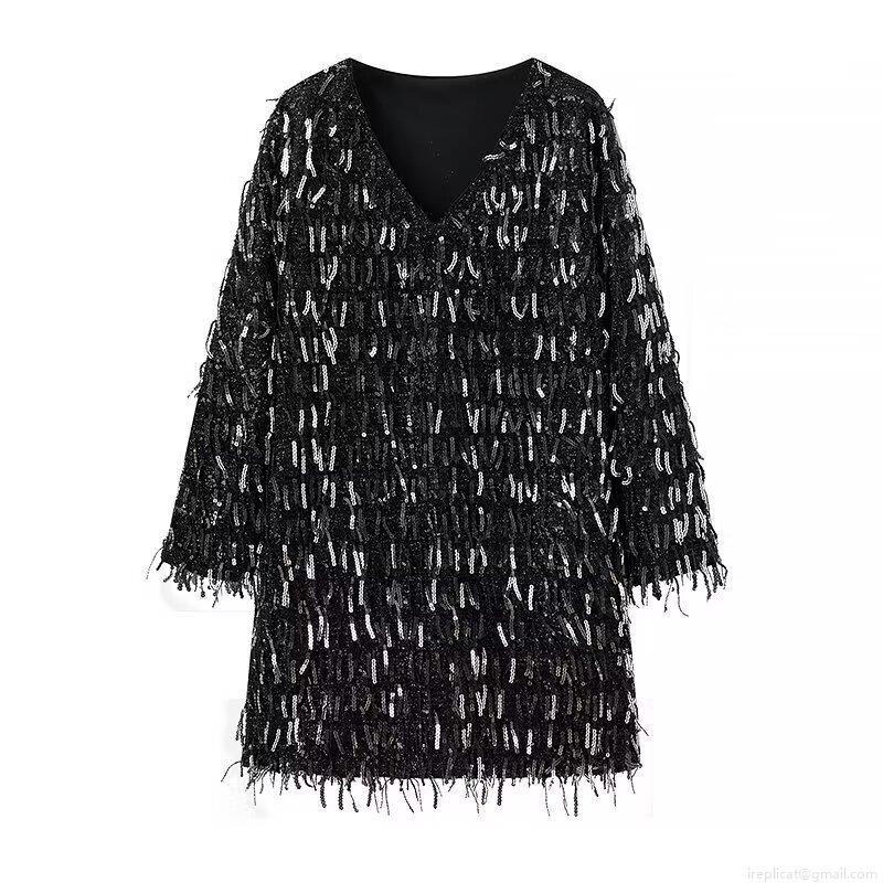 • Glamorous Black Sequin Tassel V-Neck Mini Dress Shimmering Long Sleeve Loose Streetwear Party Evening Dress For Women Nightclub Outfits