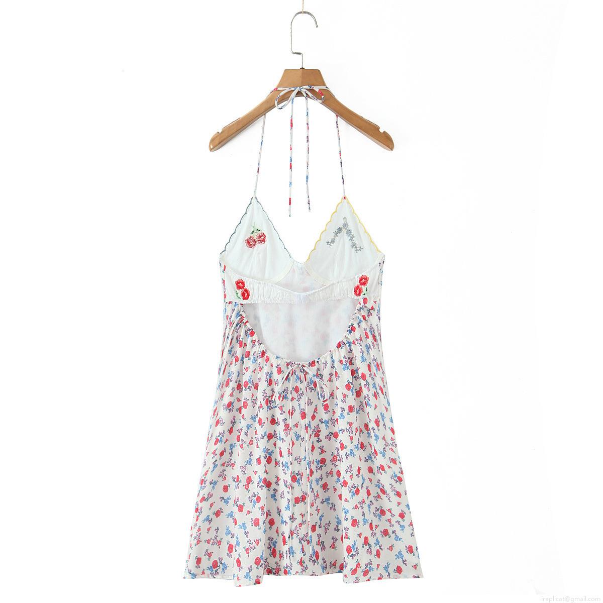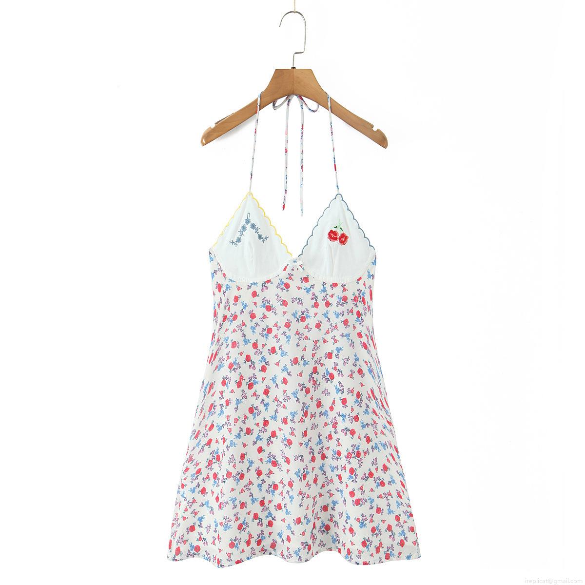 • Halter Neck Floral Mini Dress Polyester Blend With Cherry Embroidery Backless Adjustable Tie For Summer Party Sweet Girly Style Women Clothing