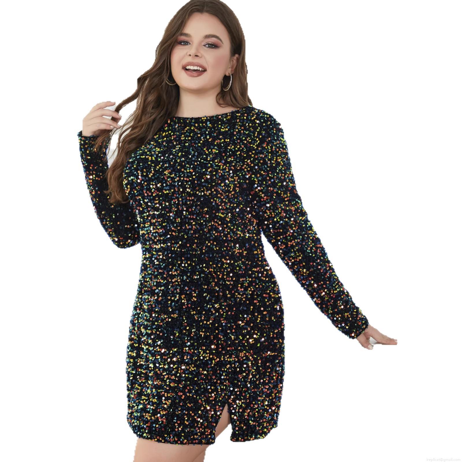 • Plus Size Women's Sexy Iridescent Sequin Mini Dress Backless Lace Up Long Sleeve Bodycon Party Evening Cocktail Dress
