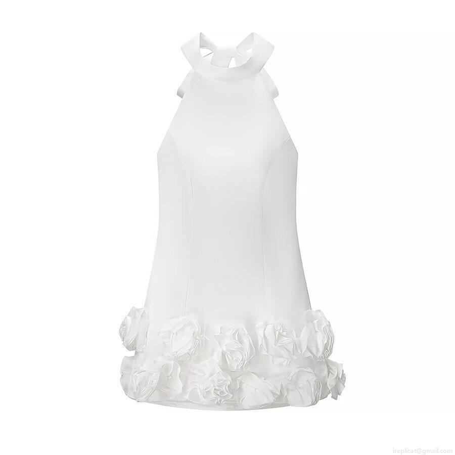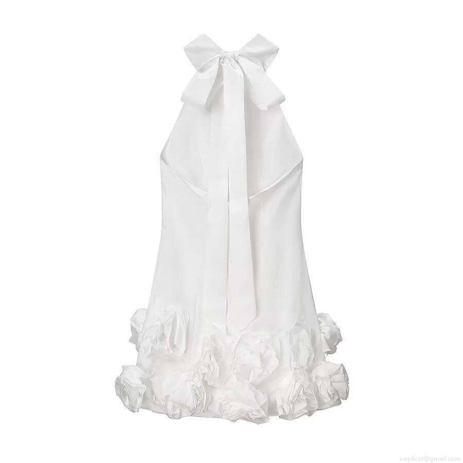 Satin Halter Mini Dress With 3D Flower Ruffle Hem And Large Back Bow Sexy Backless Bodycon Party Dress For Women White Summer Evening Dress