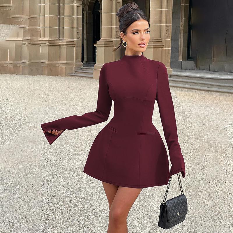 • Sexy Backless Long Sleeve Mini Dress Elegant Stand Neck A-Line Short Dress For Women Polyester Spandex Slim Fit Autumn Party Clubwear Dresses