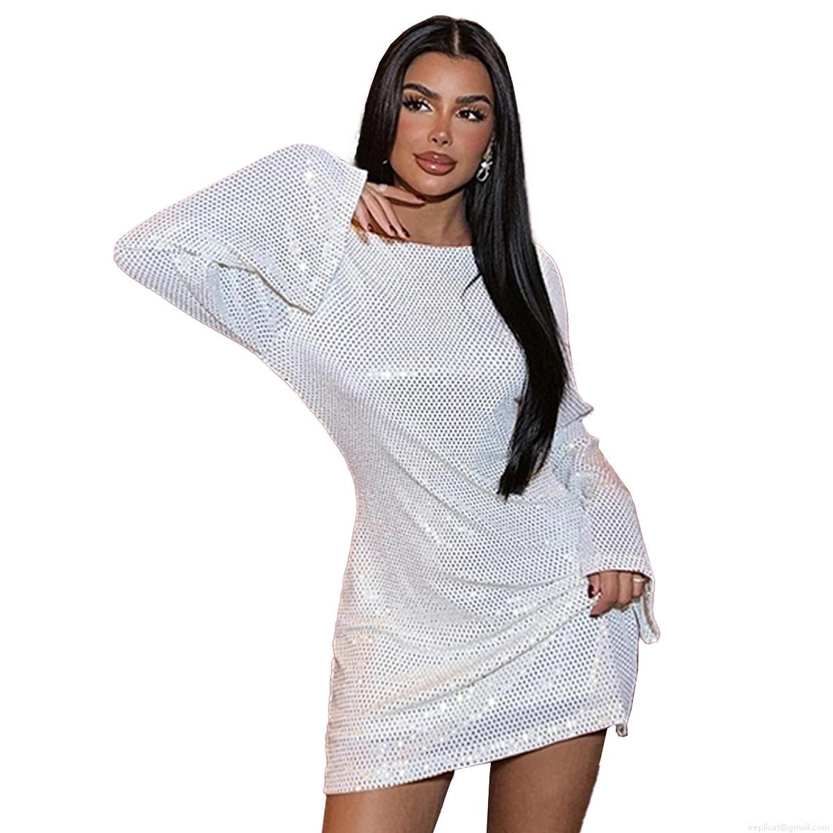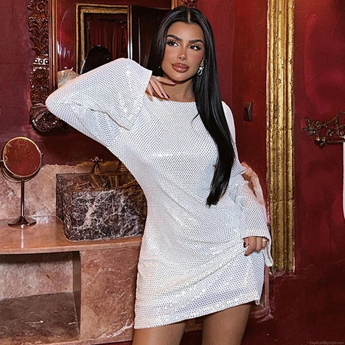 • Sexy Backless Sequin Mini Dress White Flare Long Sleeve Round Neck Slim Fit Party Bodycon Dress For Women Night Club Gown Sequin Evening Outfit