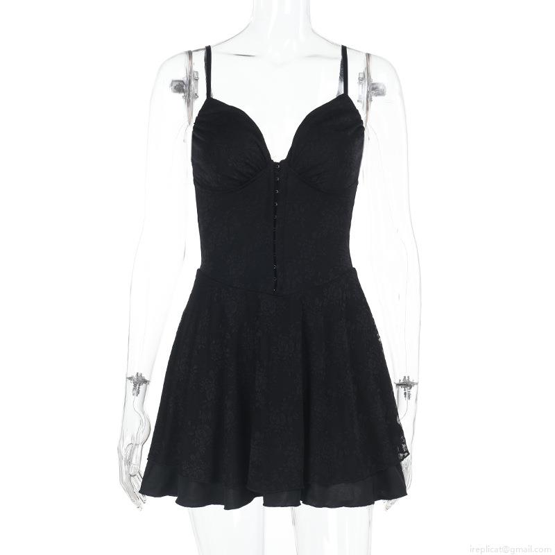 • Sexy Black Jacquard Corset Mini Dress Deep V Neck Backless Hook Eye Front Ruffle Hem A-Line Cami Dress For Women Party Clubwear