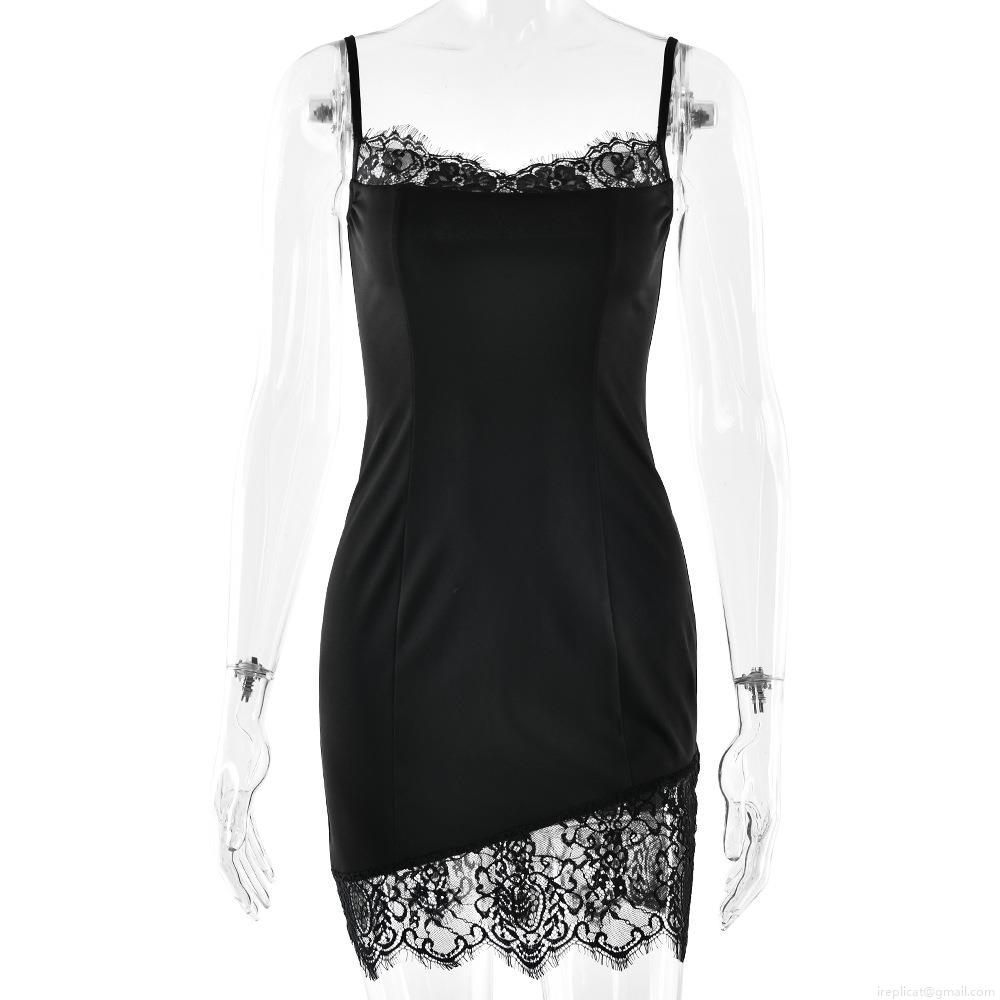 Solid Color, Lace, V-neck, Suspenders, Backless, Lace Patchwork, Irregular Hem, Hip Wrap