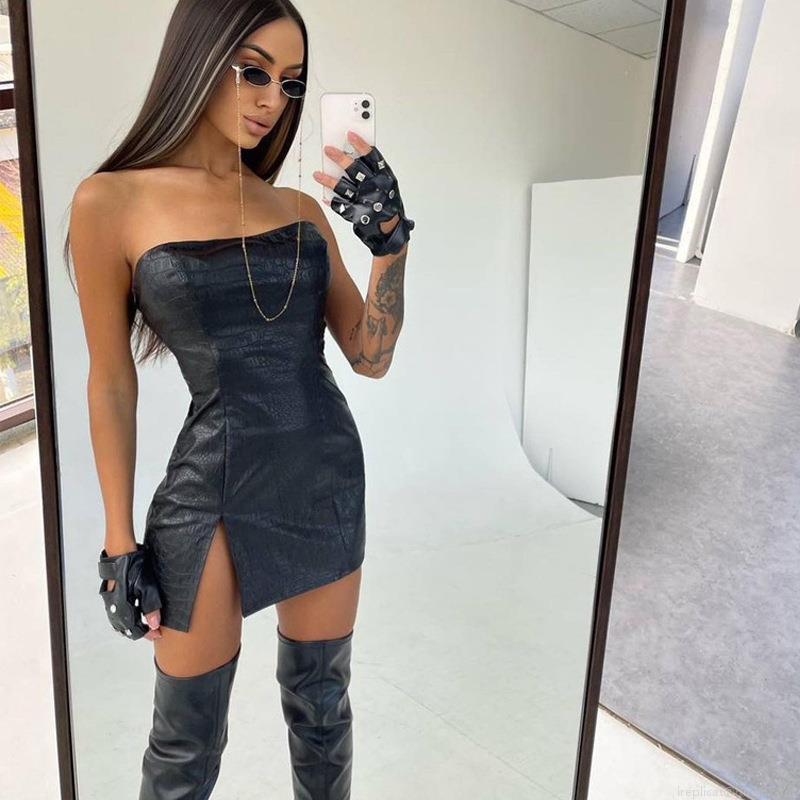 Sexy Black PU Leather Mini Dress Crocodile Embossed Tube Top Side Slit Slim Fit Bodycon Club Party Dress for Women Fashion