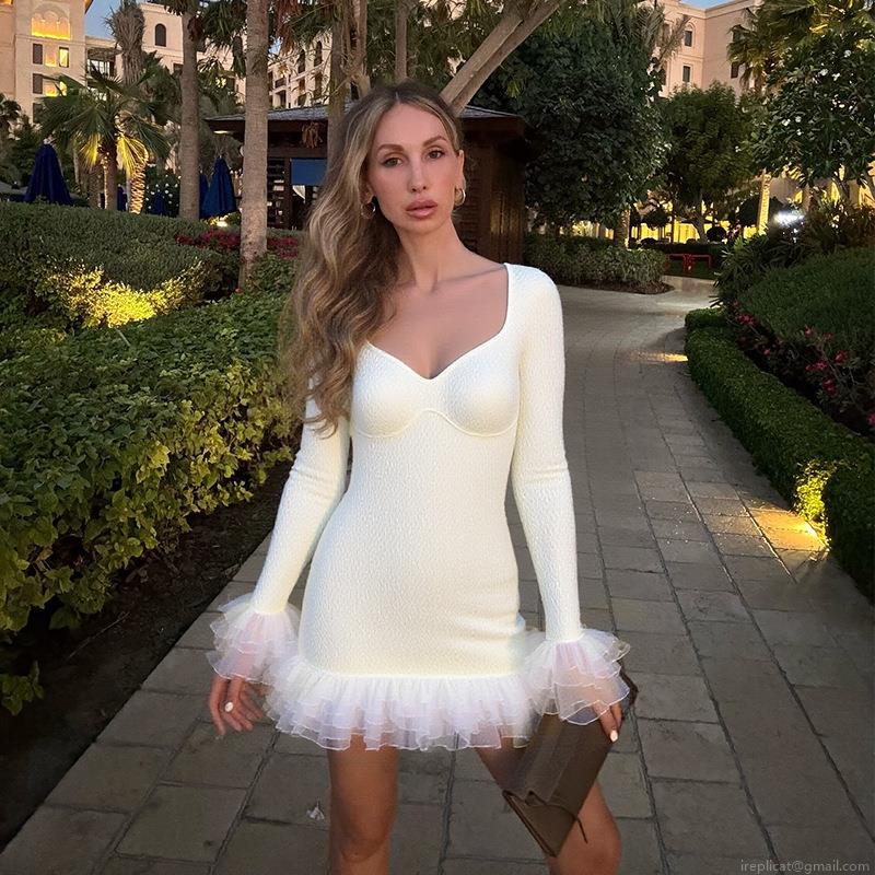 • Sexy Bodycon Mini Dress For Women Long Sleeve Ruffle Mesh Patchwork Heart Neckline Crinkled Texture Elegant Sweet Party Clubwear Fall Spring Ivory White
