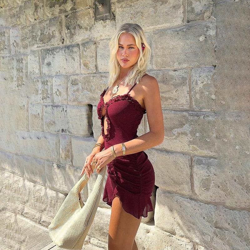 Sexy Burgundy Red Shimmer Glitter Cut Out Ruffle Mini Dress Women Bodycon Ruched Summer Party Vacation Sleeveless Spaghetti Strap V-Neck Short Dress
