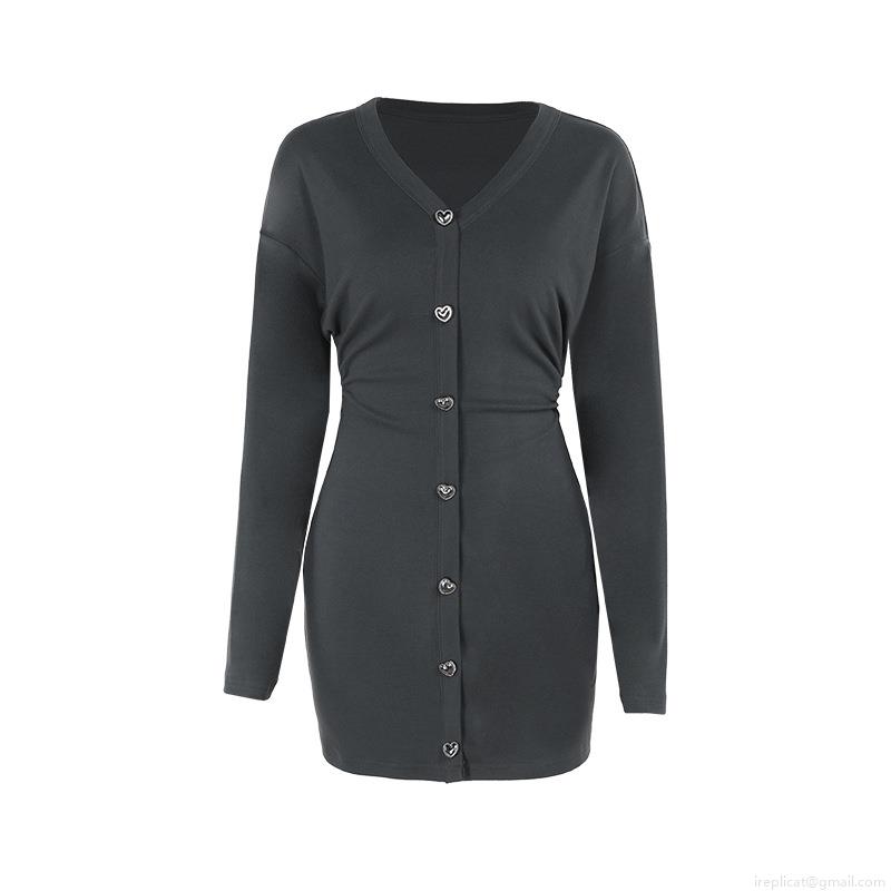 • Sexy Deep V-Neck Knit Long Sleeve Mini Dress With Heart Shaped Buttons Autumn Elegant Slim Fit Solid Color Polyester Spandex Bodycon Dress For Women Party Dating
