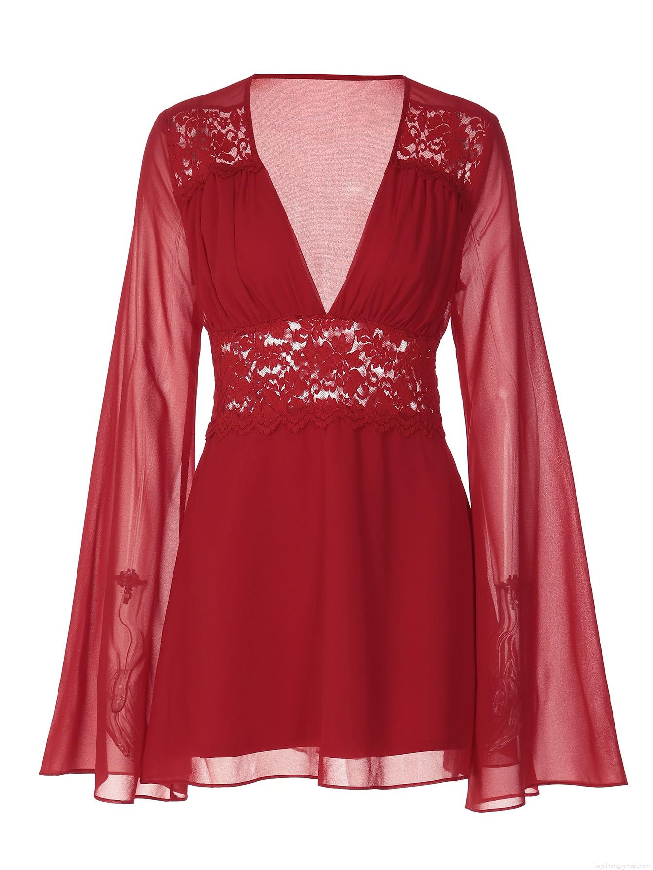Solid Color, Splice, Lace, Mesh, Deep V, Bell Sleeves