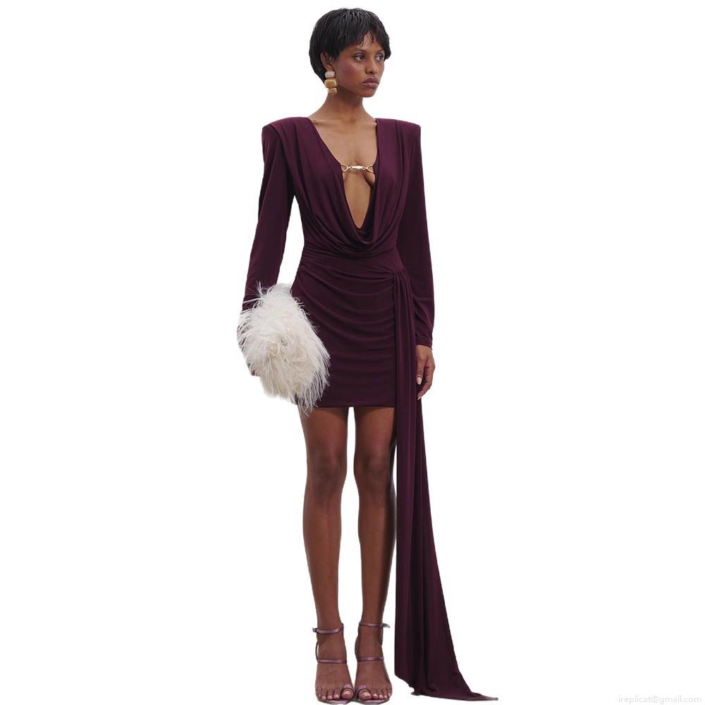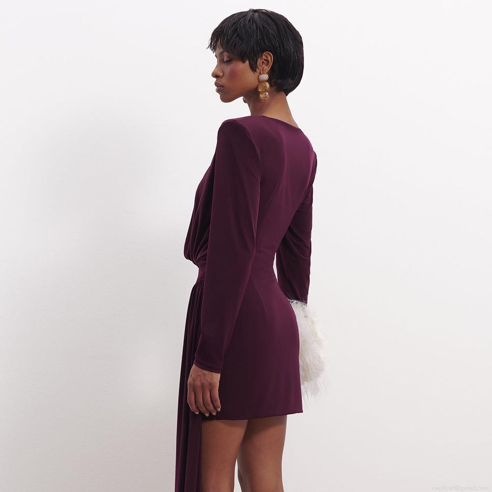 • Sexy Deep V-Neck Long Sleeve Mini Bodycon Dress For Women Polyester Milk Silk Pleated Ruffle Streamer Evening Party Clubwear Slim Fit Gown With Metal Chain Detail