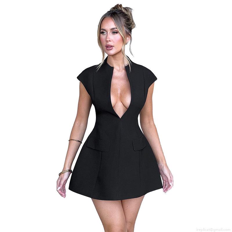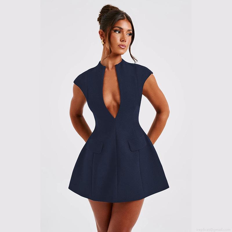 • Sexy Deep V-Neck Sleeveless Mini A-Line Dress Women Polyester Spandex Slim Fit High Waist Short Dress With Pocket Decor For Party Club Streetwear Lady