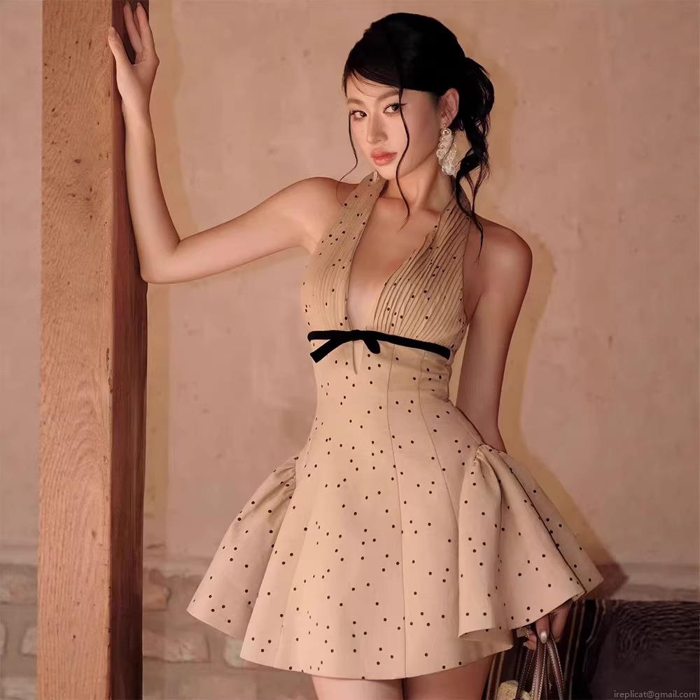 • Sexy French Polka Dot Halter Backless Dress Women Polyester V Neck Pleated High Waist Mini Party Dress Elegant Bow Decor Sleeveless A-Line Short Dress