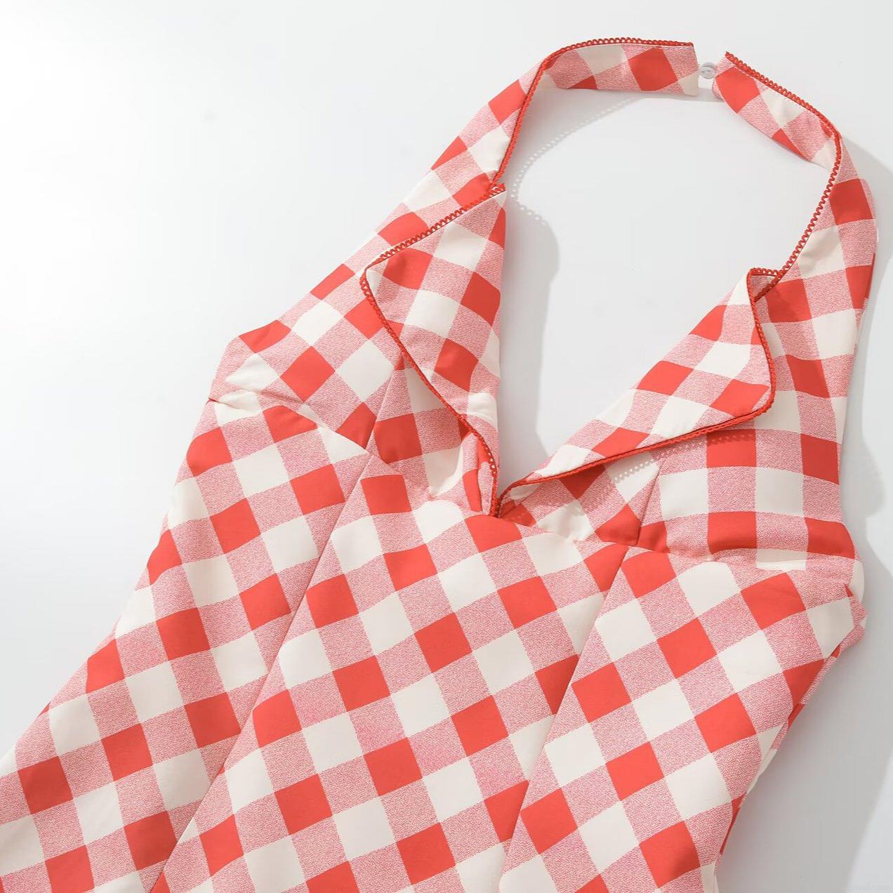 • Sexy Gingham Halter Mini Dress For Women Retro Red White Plaid Backless A-Line Short Dress Slim Fit Lace Up Summer Casual Party Outfits