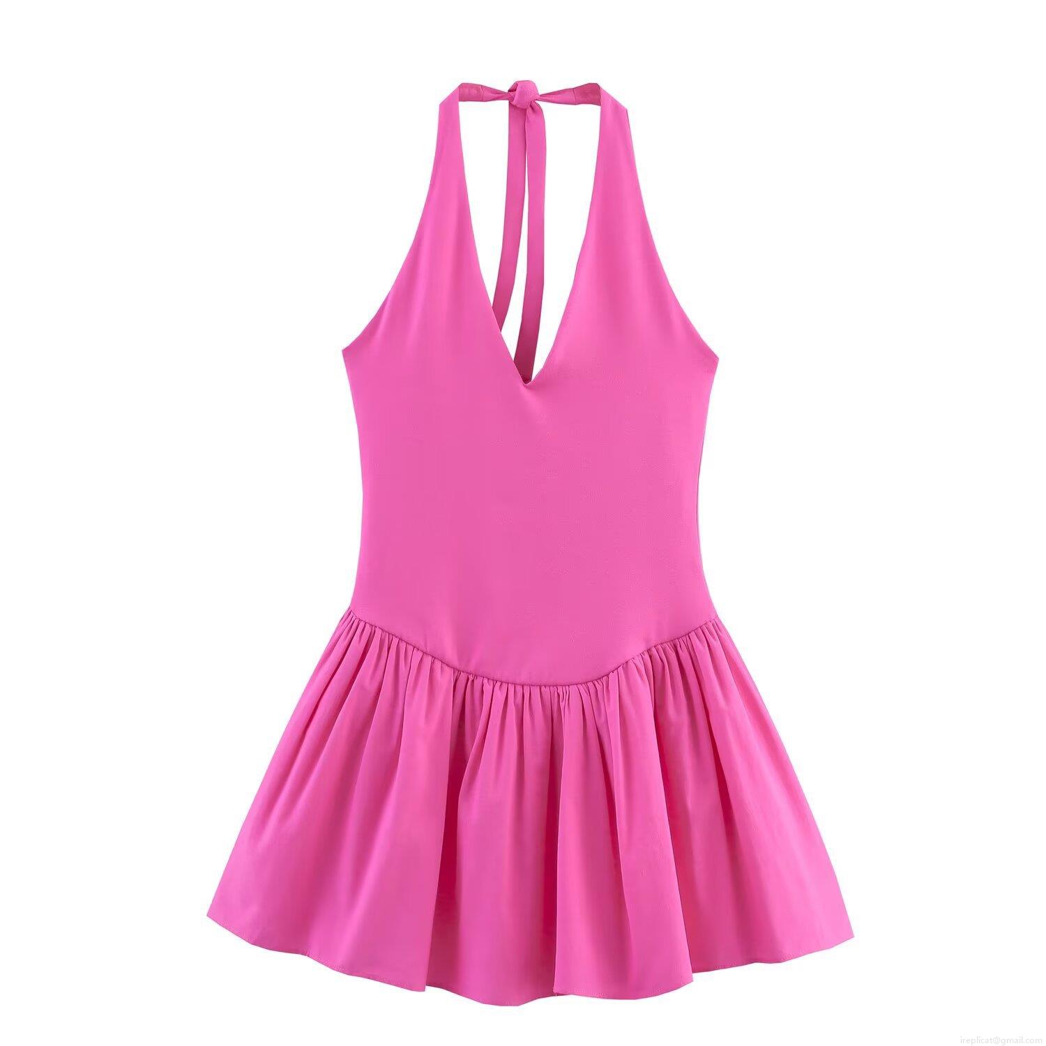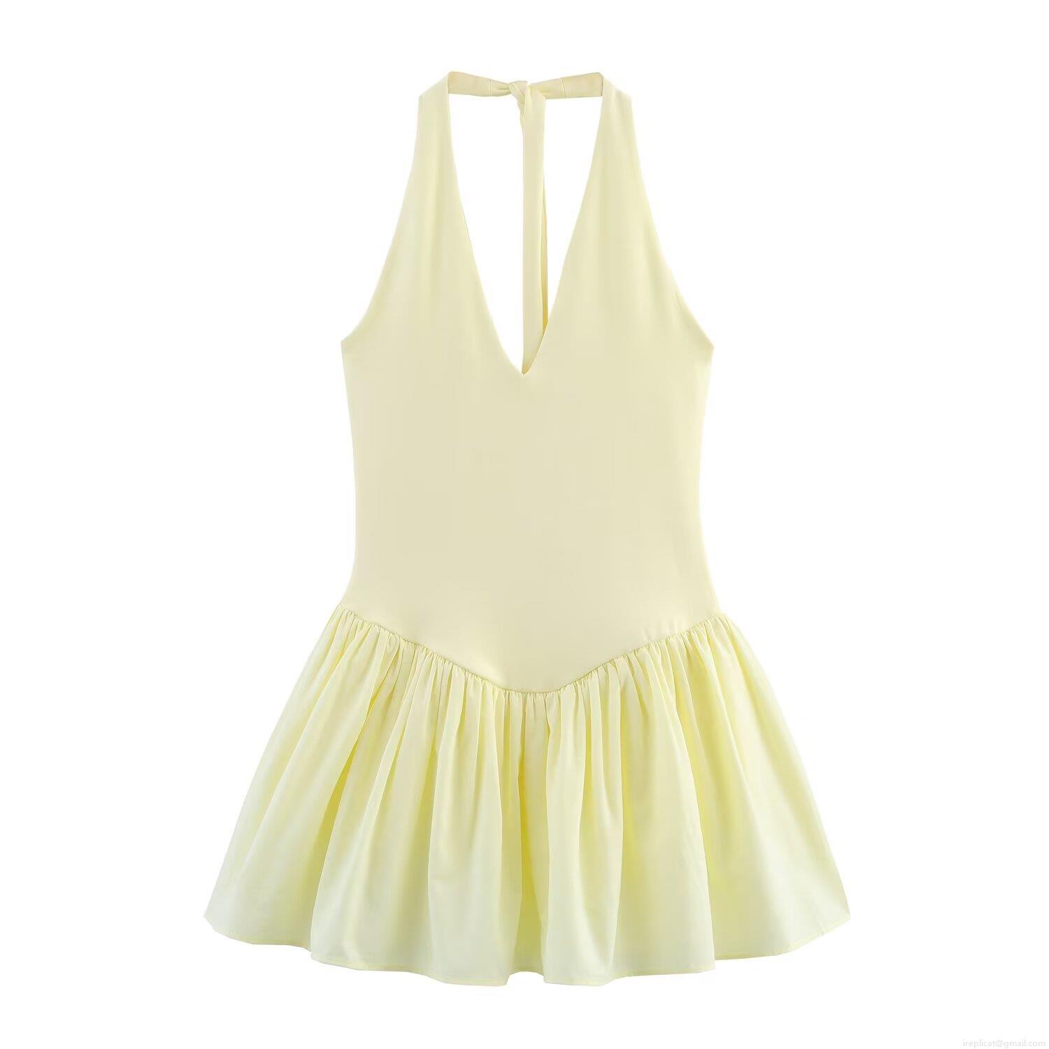 • Sexy Halter Neck Deep V Mini Dress Polyester Knitted Pleated Ruffle Sleeveless Backless Sundress For Women Party Clubwear Elegant Solid Color Casual Summer Outfit