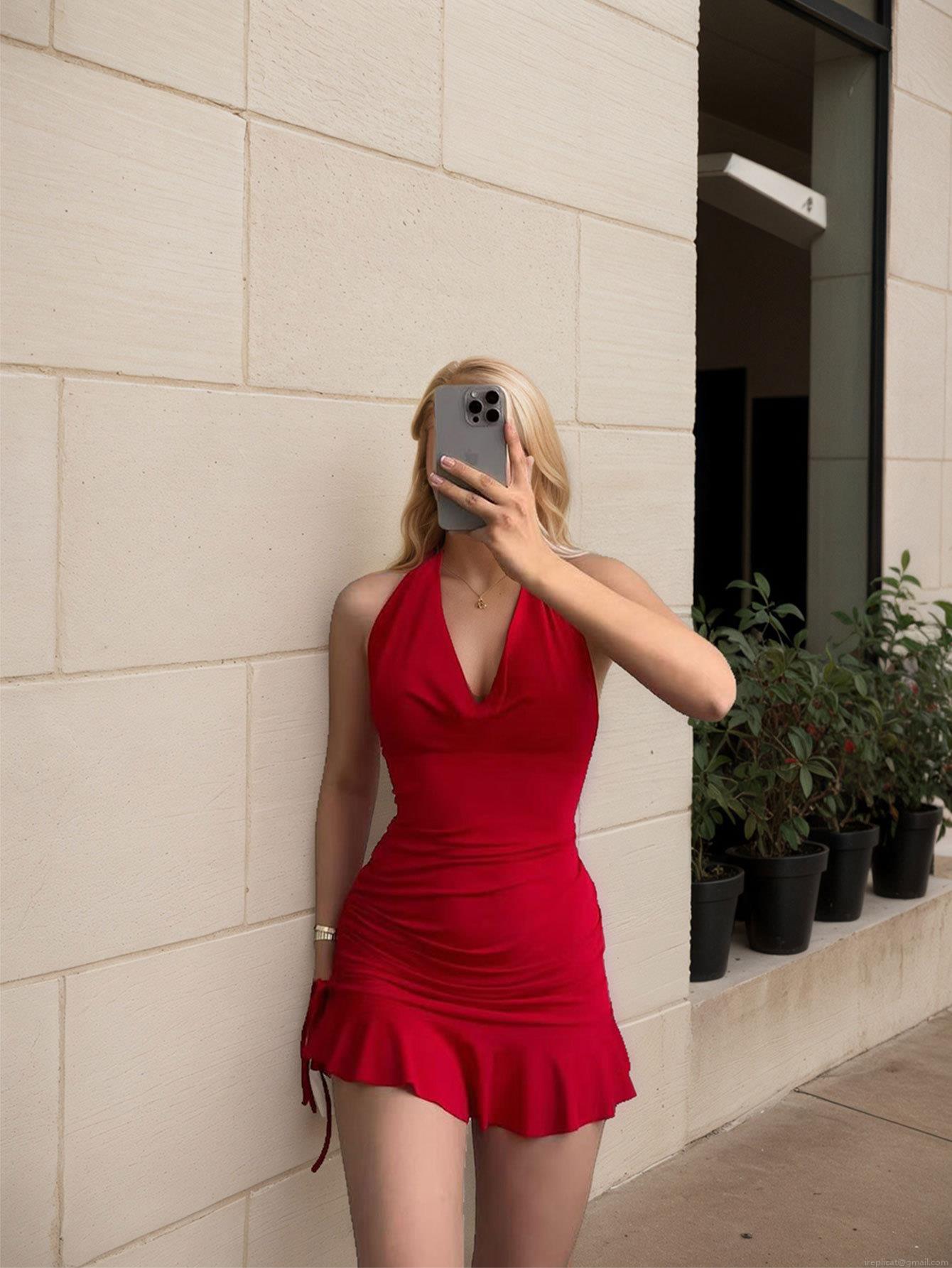 • Sexy Halter Neck V-Neck Mini Dress Polyester Spandex Knit Ruched Bodycon Ruffle Hem Backless Dress For Women Party Clubwear Summer