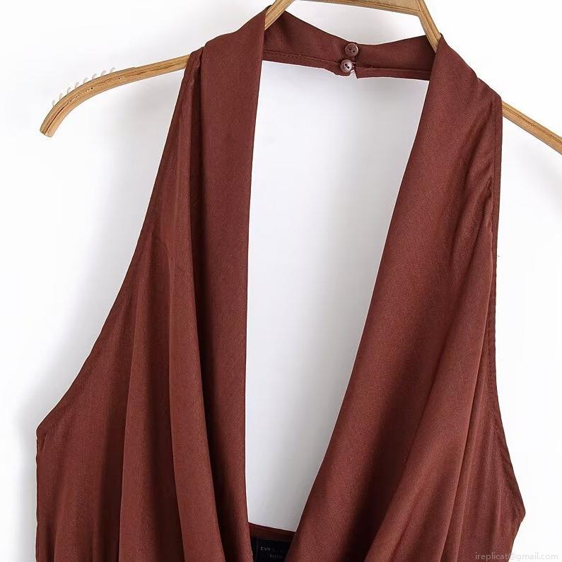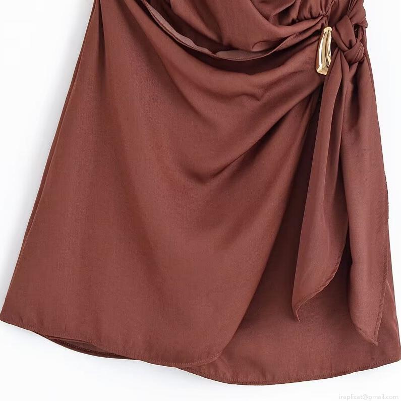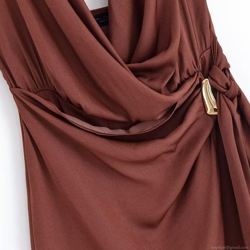 • Sexy Halter Neck V-Neck Sleeveless Backless Satin Mini Dress With Gold Metal Buckle Pleated Solid Color Party Clubwear Slim Fit Evening Dresses For Women