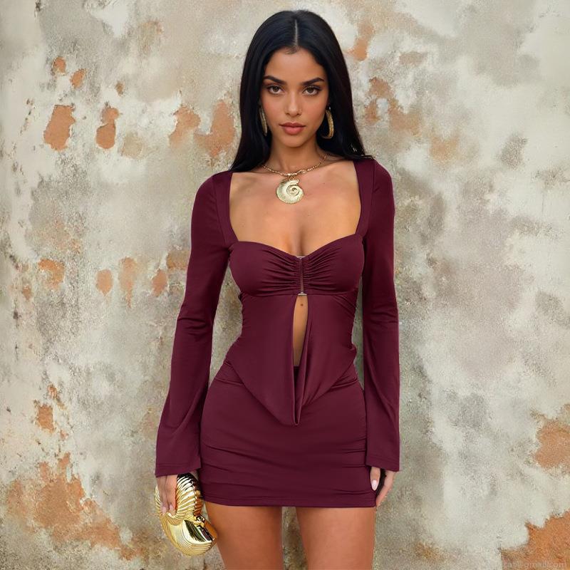 • Sexy Hollow Out Backless Mini Dress Long Sleeve Bodycon Party Clubwear Dress With Metal Ring Decoration Polyester Spandex Solid Evening Women Dress