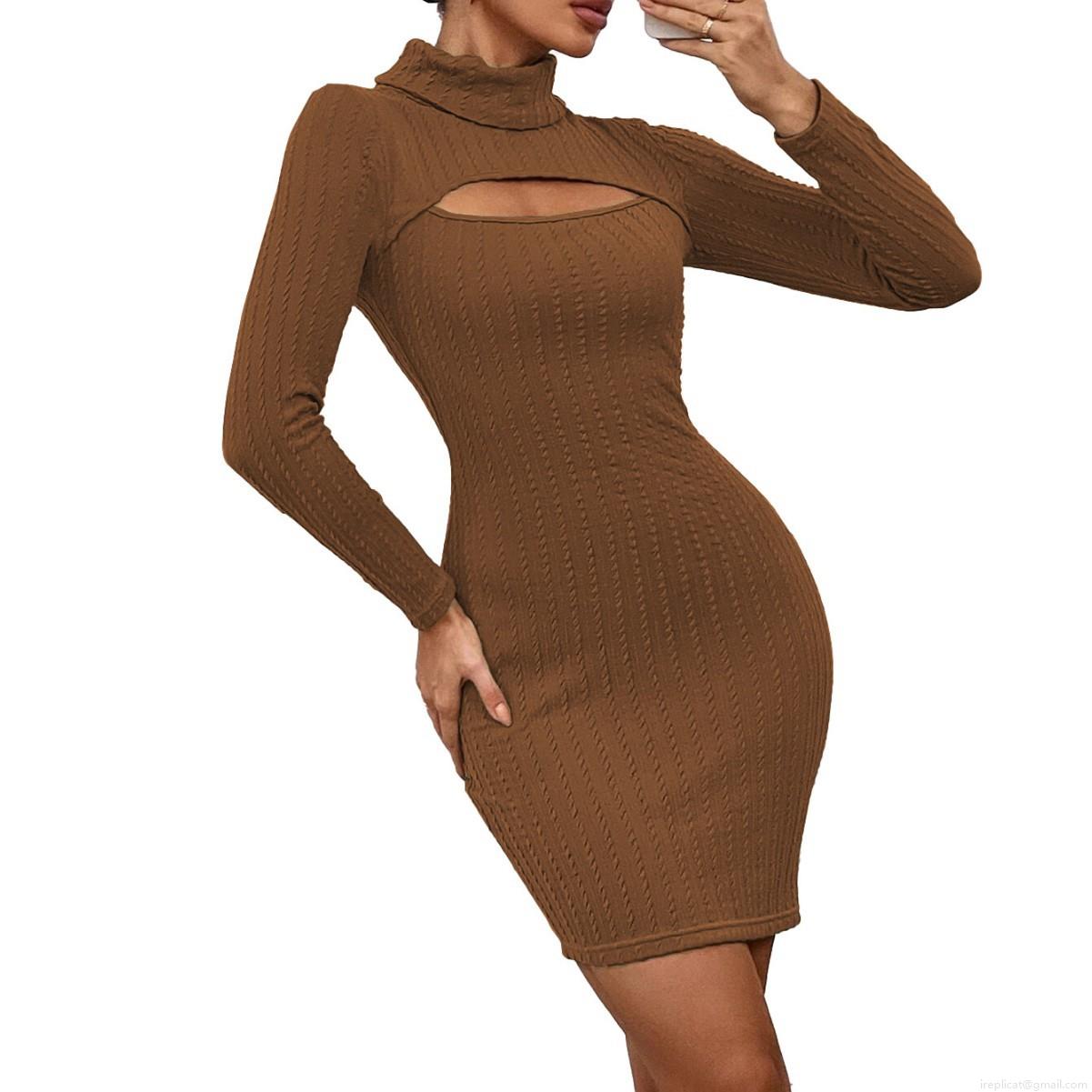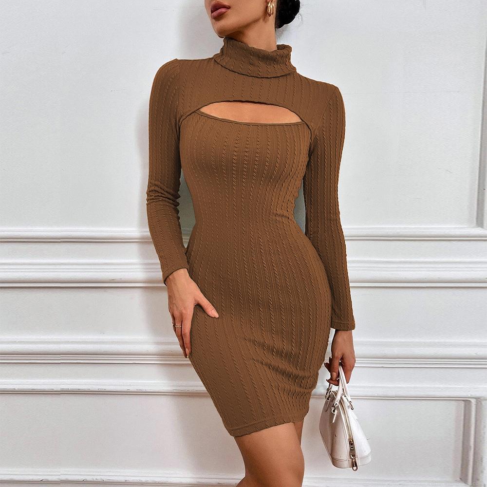 Sexy Hollow Out High Neck Bodycon Mini Dress For Women Solid Color Long Sleeve Ribbed Knit Slim Fit Short Pencil Dress Cotton Blend Autumn Winter Fashion
