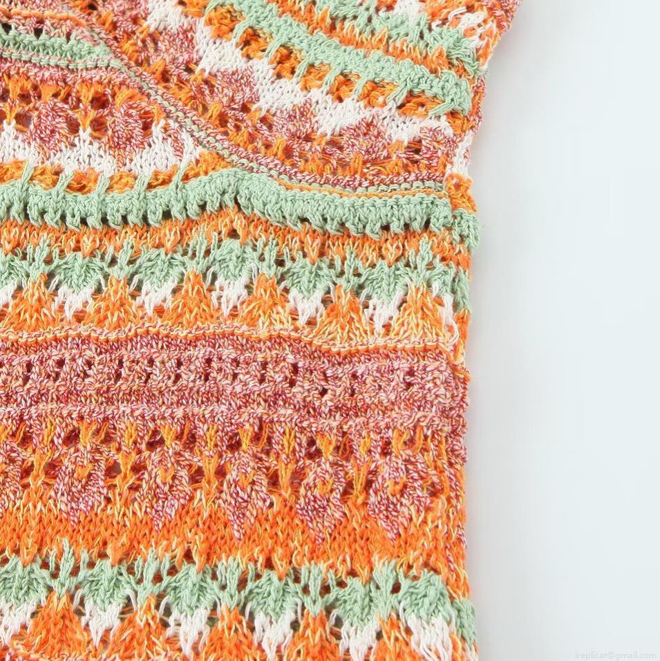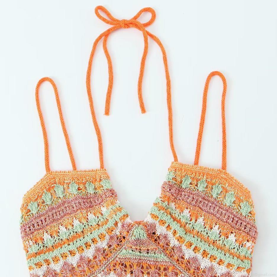 • Sexy Knitted Mini Dress Bohemian Crochet Polyester Backless V-Neck Halter Strappy Bodycon Multi-Color Striped Summer Beach Vacation Dress For Women