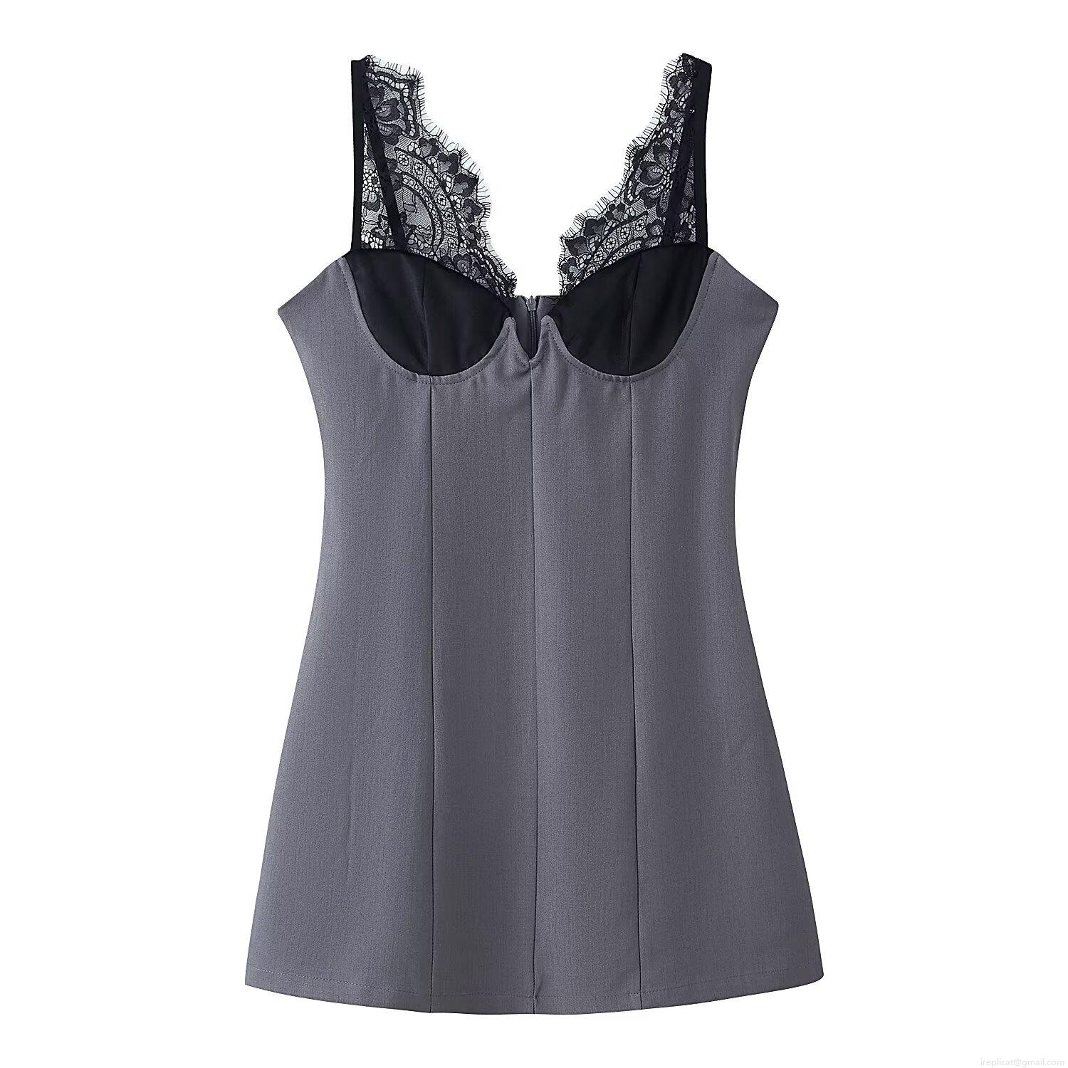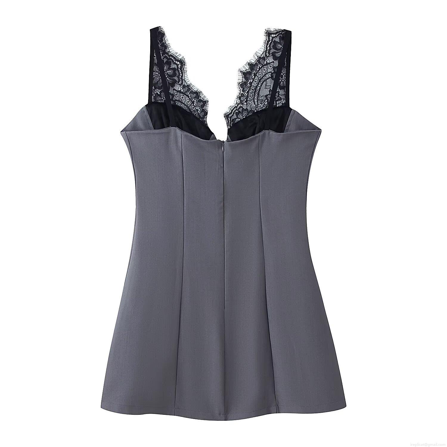 • Sexy Lace Deep V-Neck Slim Fit Camisole Mini Dress Women Grey Black Stitching Sleeveless Backless Bodycon Party Clubwear Summer Fashion Dress