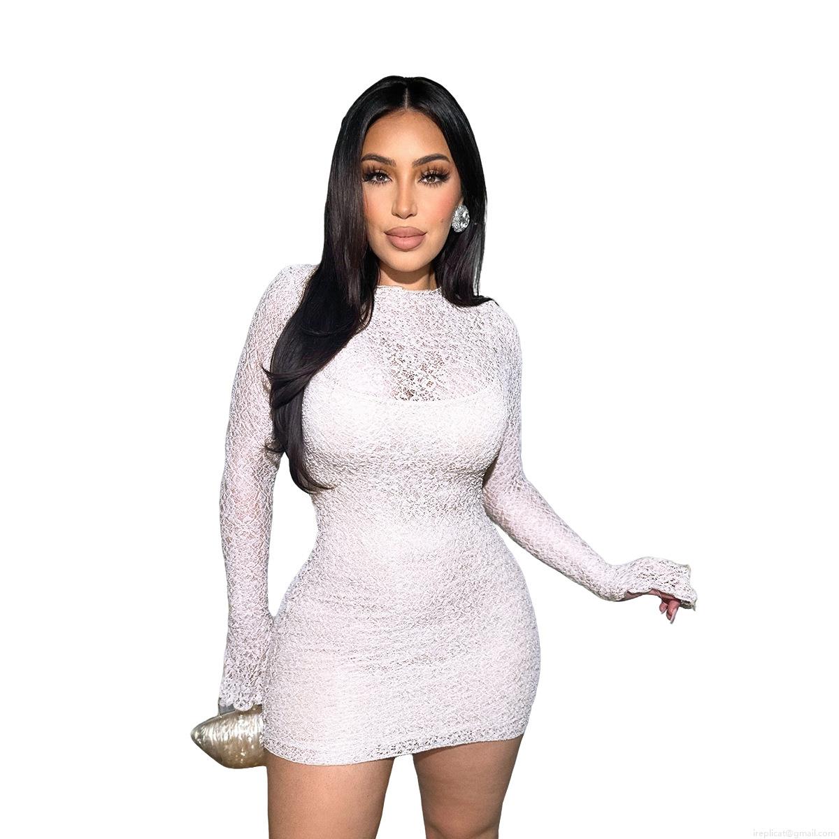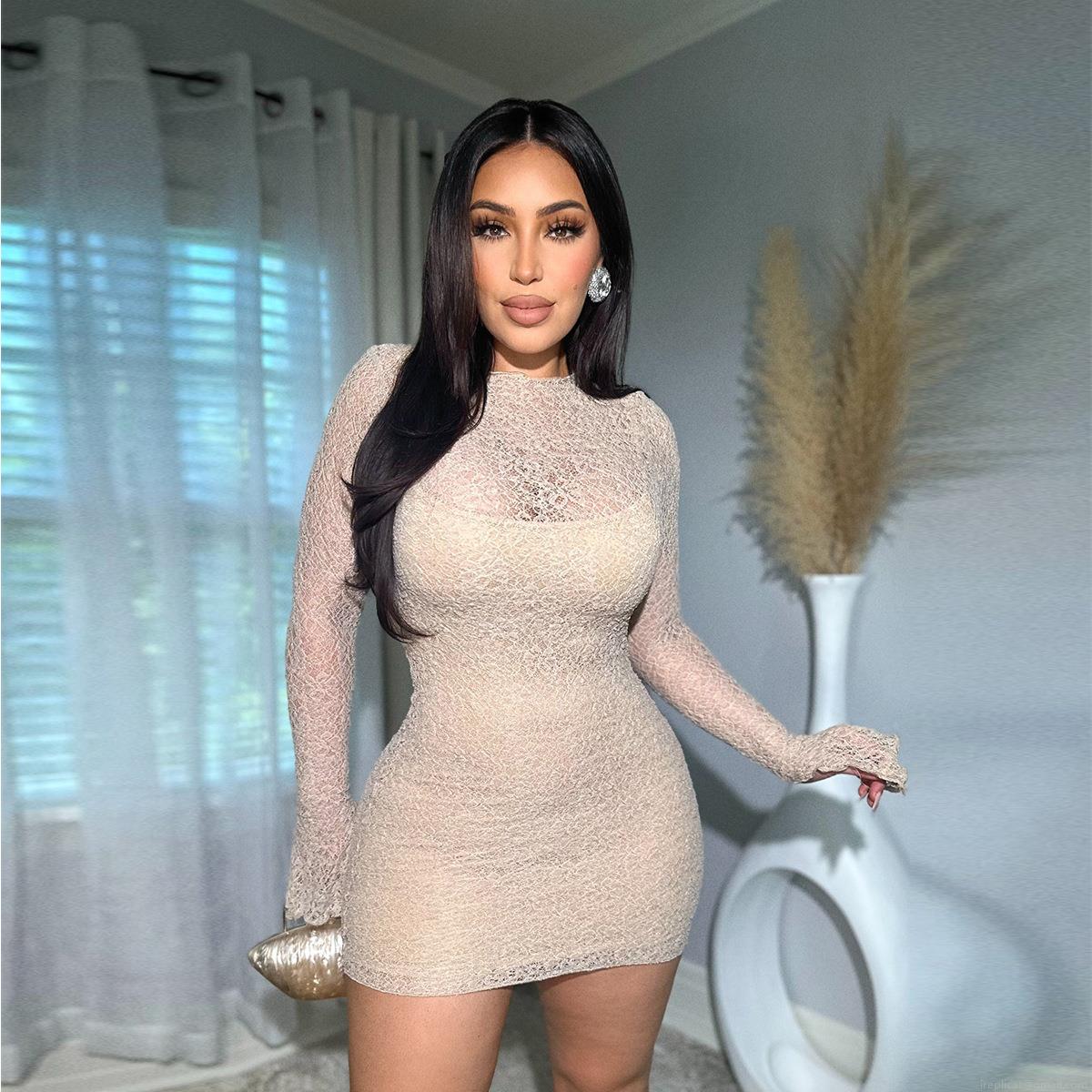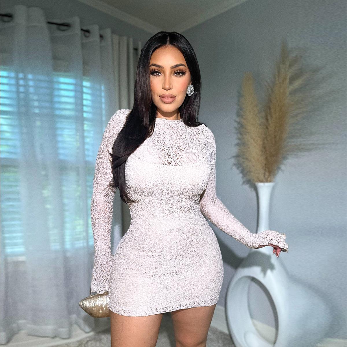 Sexy Lace Mini Dress Long Sleeve Hollow Out Bodycon Party Clubwear For Women Elegant Round Neck Slim Fit Sheer Floral Overlay Cocktail Gown