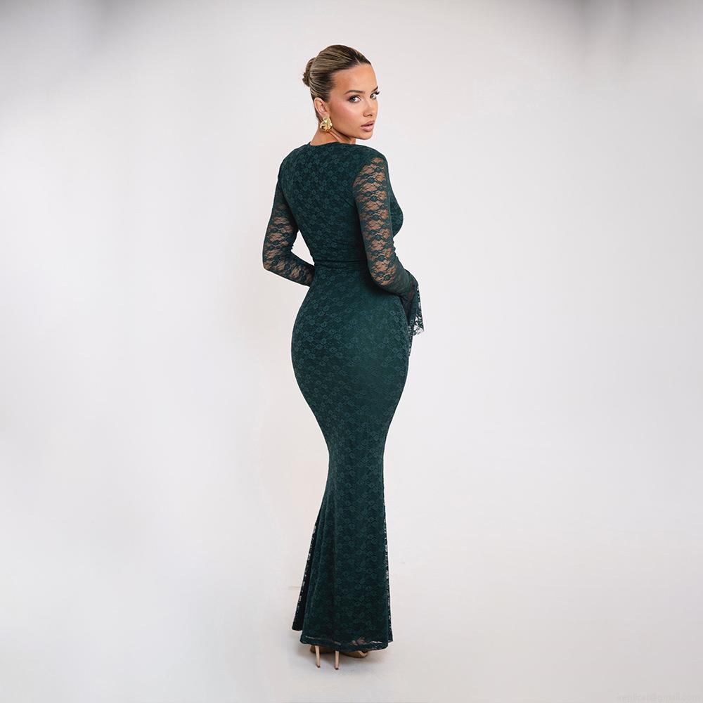 Sexy Lace Patchwork V-Neck Maxi Dress Long Trumpet Sleeve Slim Fit Fish Tail Evening Party Bodycon Dress For Women Elegant Wedding Guest Gown