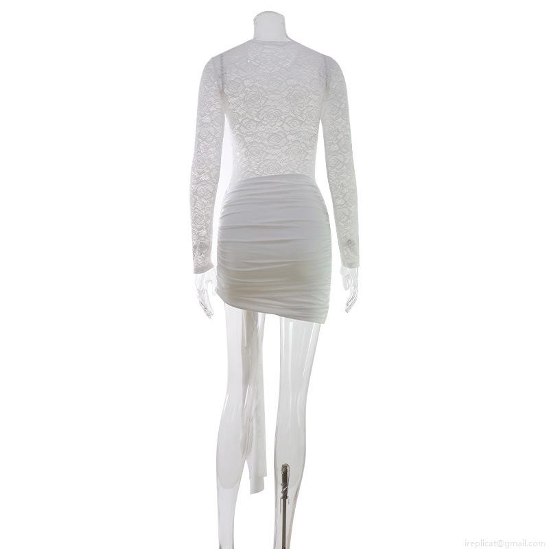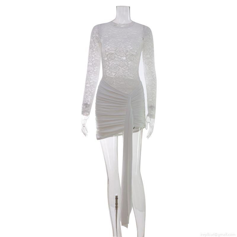 • Sexy Lace Stitching Bodycon Mini Dress For Women Elegant Round Neck Long Sleeve Ruched Party Dress Solid White Slim Fit Cocktail Clubwear With Draped Detail