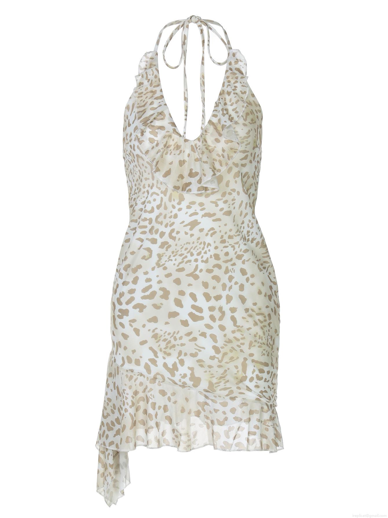 • Sexy Leopard Print Halter Neck Mini Dress For Women Sleeveless Deep V Neck Ruffle Hem Bodycon Club Party Dress Polyester Spandex Y2K Style Summer Sundress
