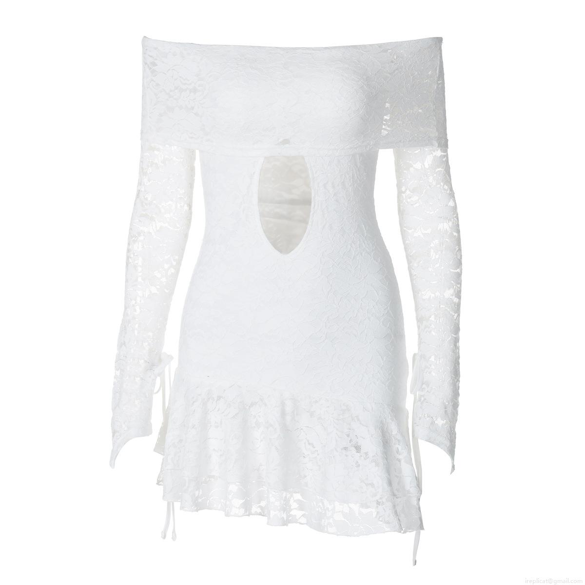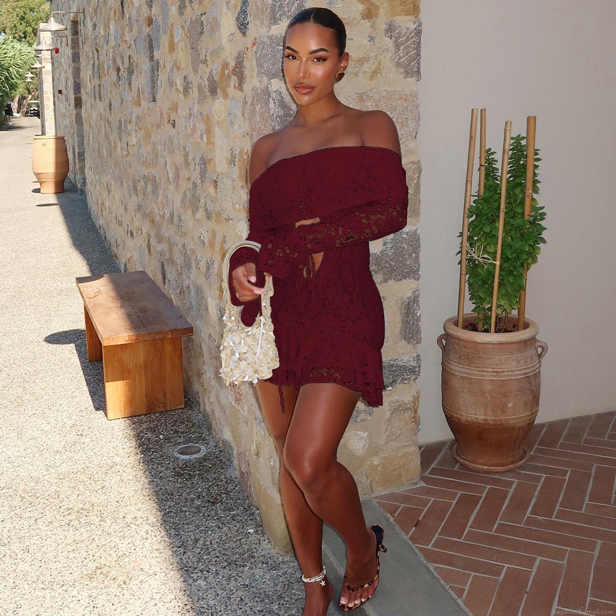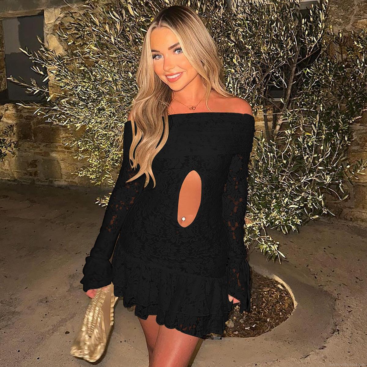 • Sexy Off-Shoulder Floral Lace Mini Dress Long Sleeve Hollow Out Waist Ruffle Hem Bodycon Party Club Vacation Dress For Women