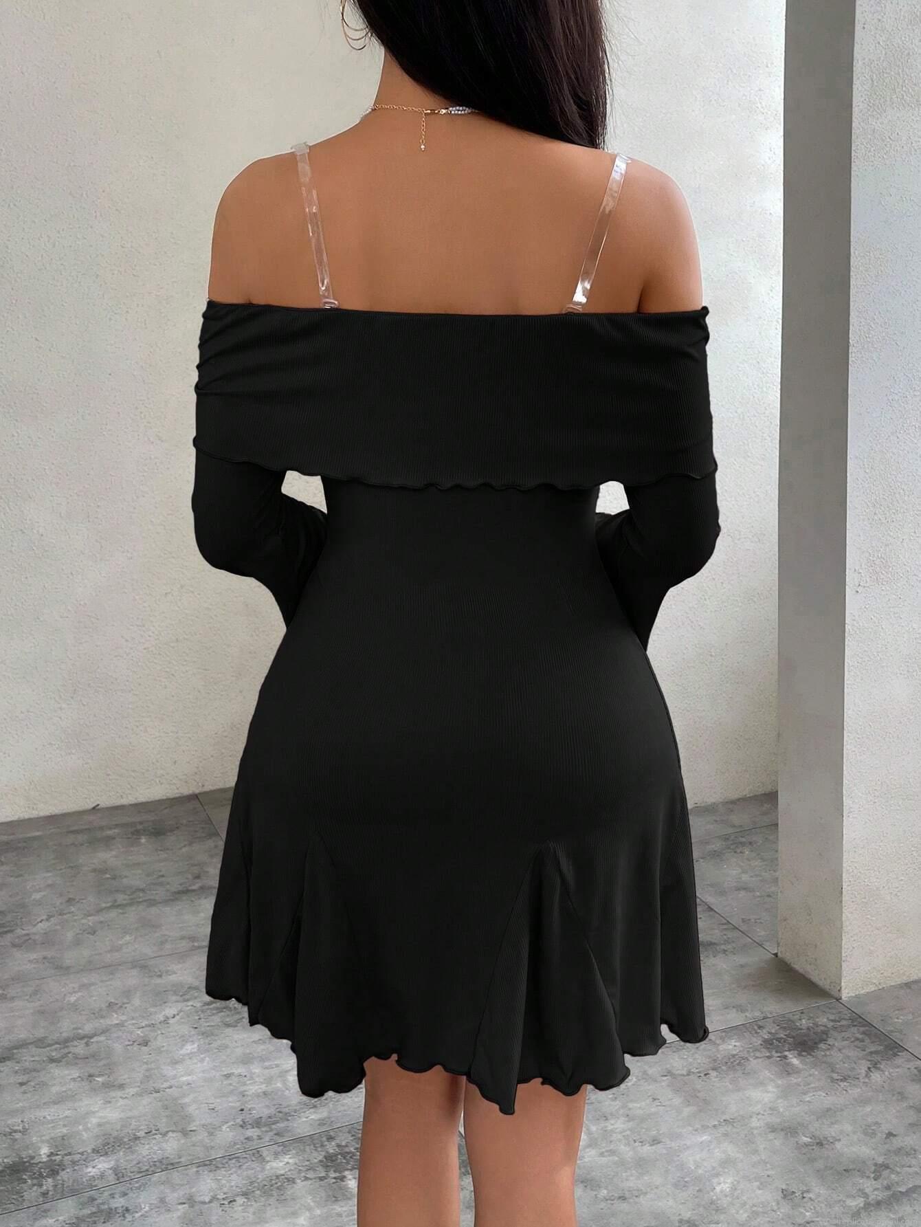 • Sexy Off-The-Shoulder Mini Dress Polyester Elastane Ribbed Knit Long Bell Sleeve Slim Fit Bodycon Party Short Dress For Women