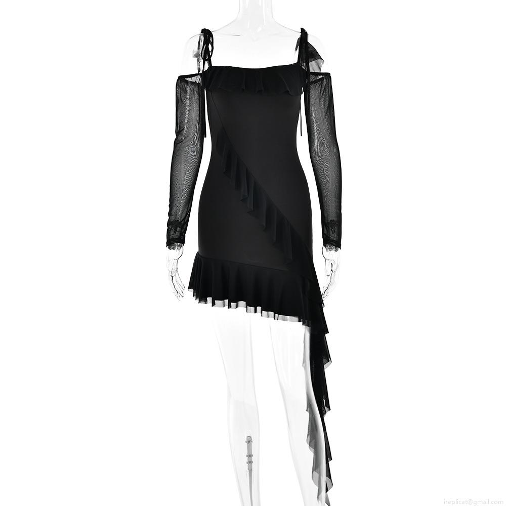 • Sexy Off-the-shoulder Ruffle Mini Dress For Women Backless Mesh Patchwork Long Sleeve Asymmetric Hem Fishtail Bodycon Club Party Dress