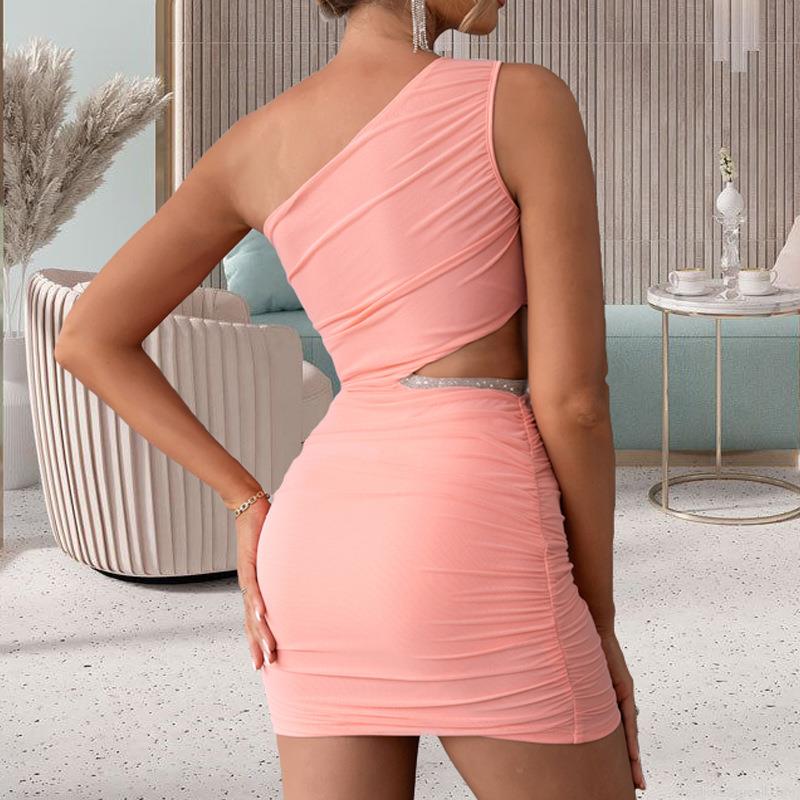 • Sexy One Shoulder Ruched Mini Dress For Women Hollow Out Waist With Rhinestone Trim Bodycon Club Party Sleeveless Short Dress