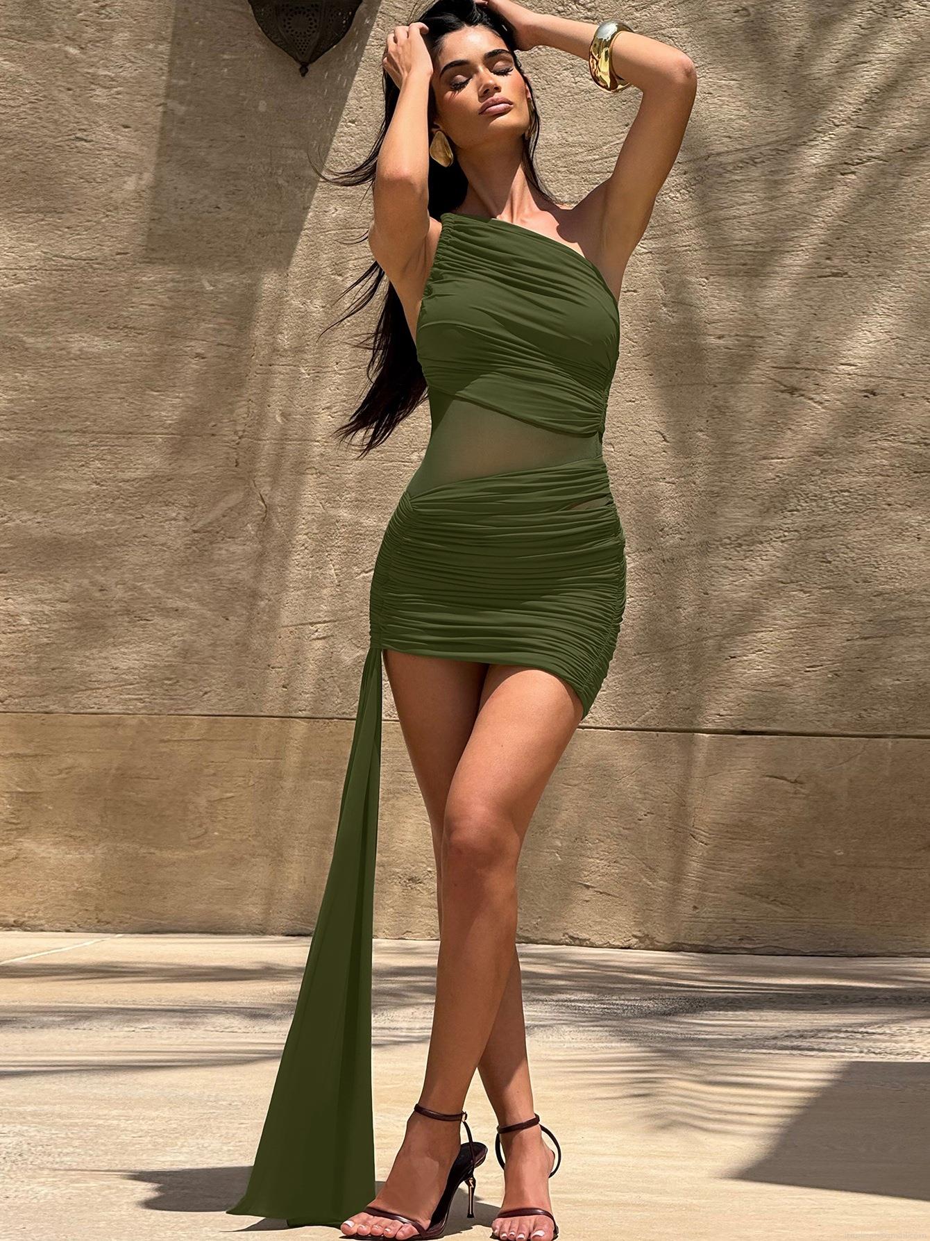 • Sexy One Shoulder Ruched Mini Dress Women Mesh Patchwork Bodycon Nightclub Party Dress Draped Side Streamer Summer Sleeveless Slim Fit Outfits