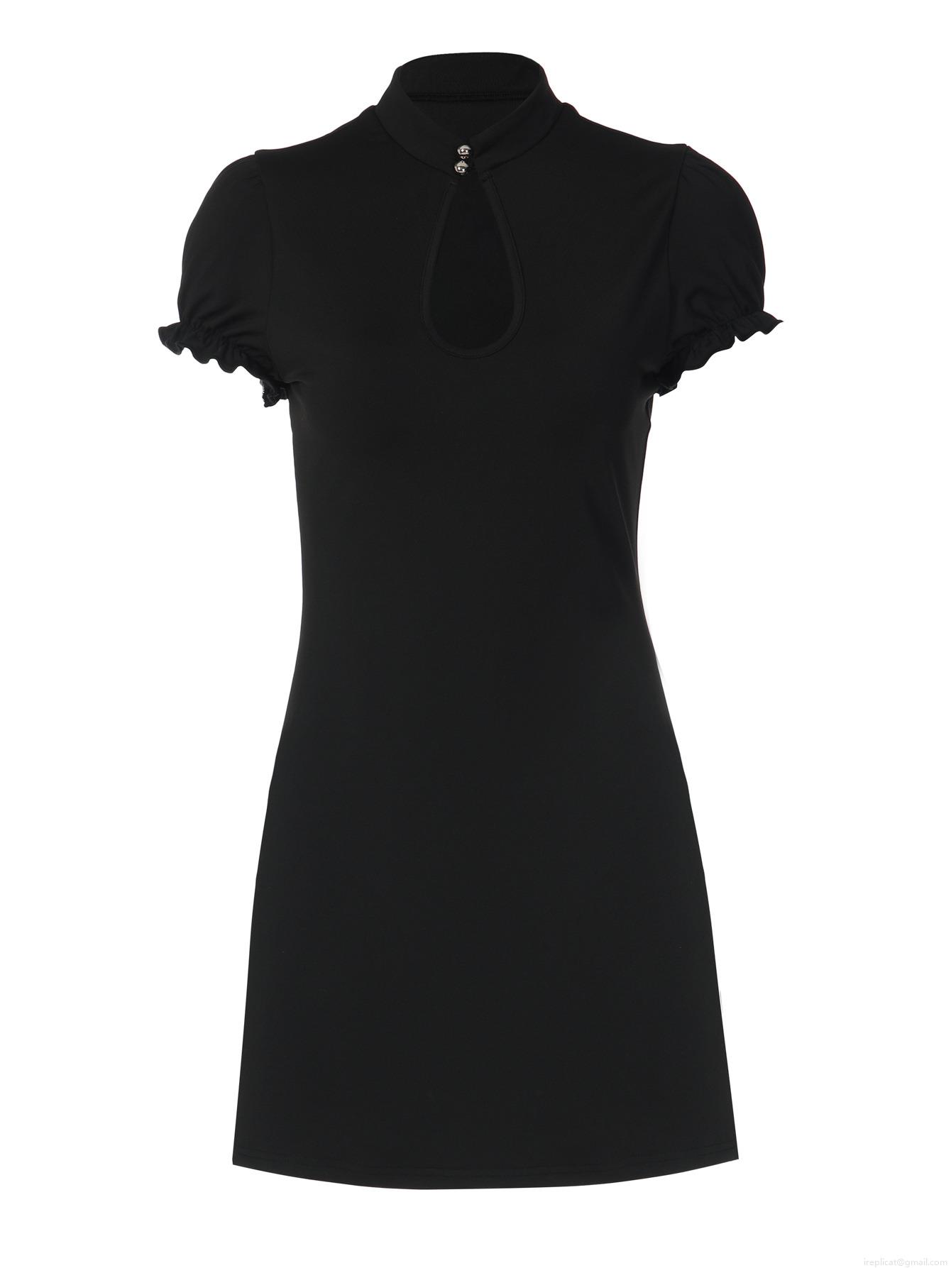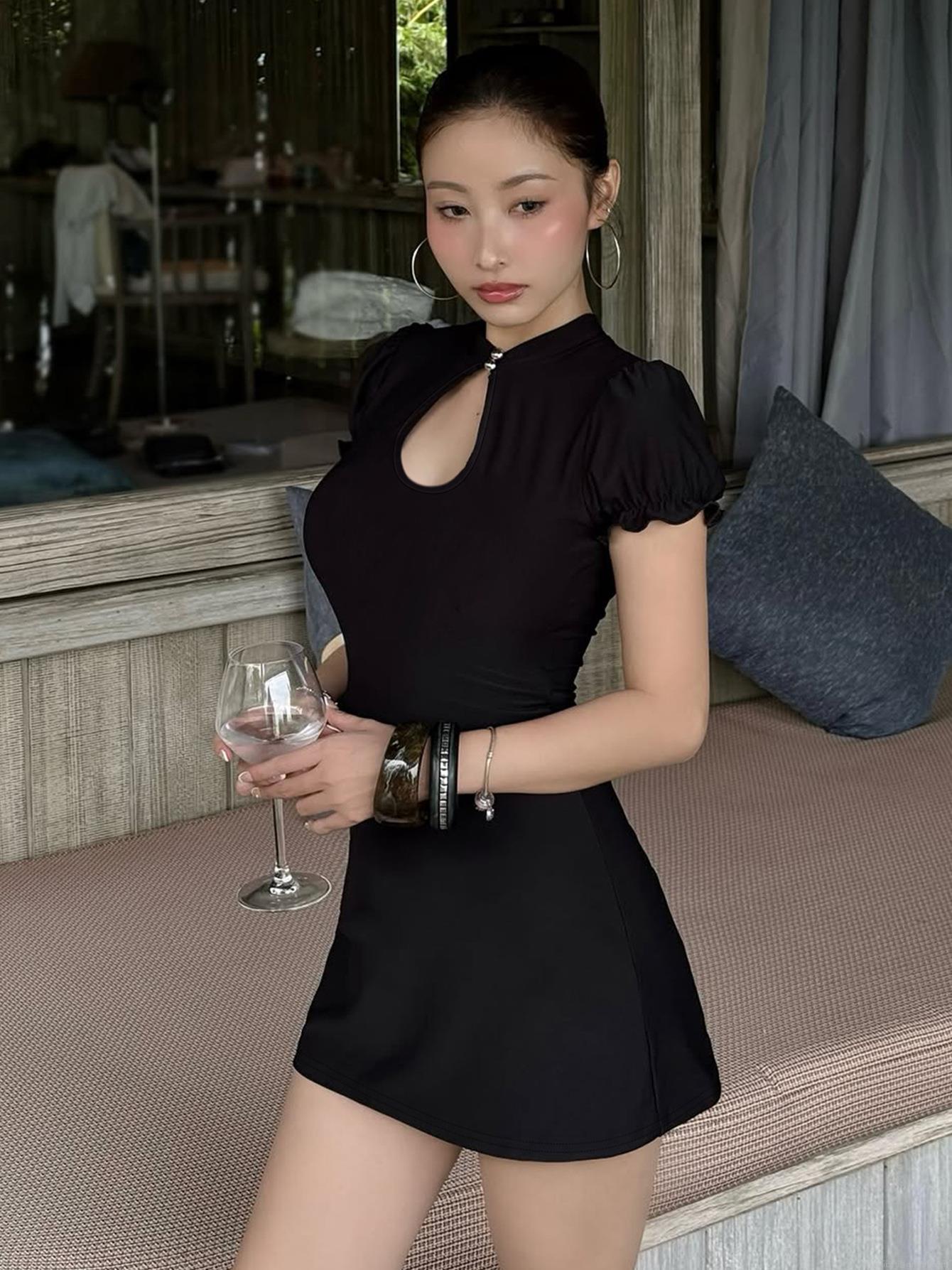 • Sexy Polyester Spandex Bodycon Mini Dress For Women Stand Collar Water Drop Hollow Out Short Puff Sleeve Club Party Wear Nightclub Slim Fit Dress