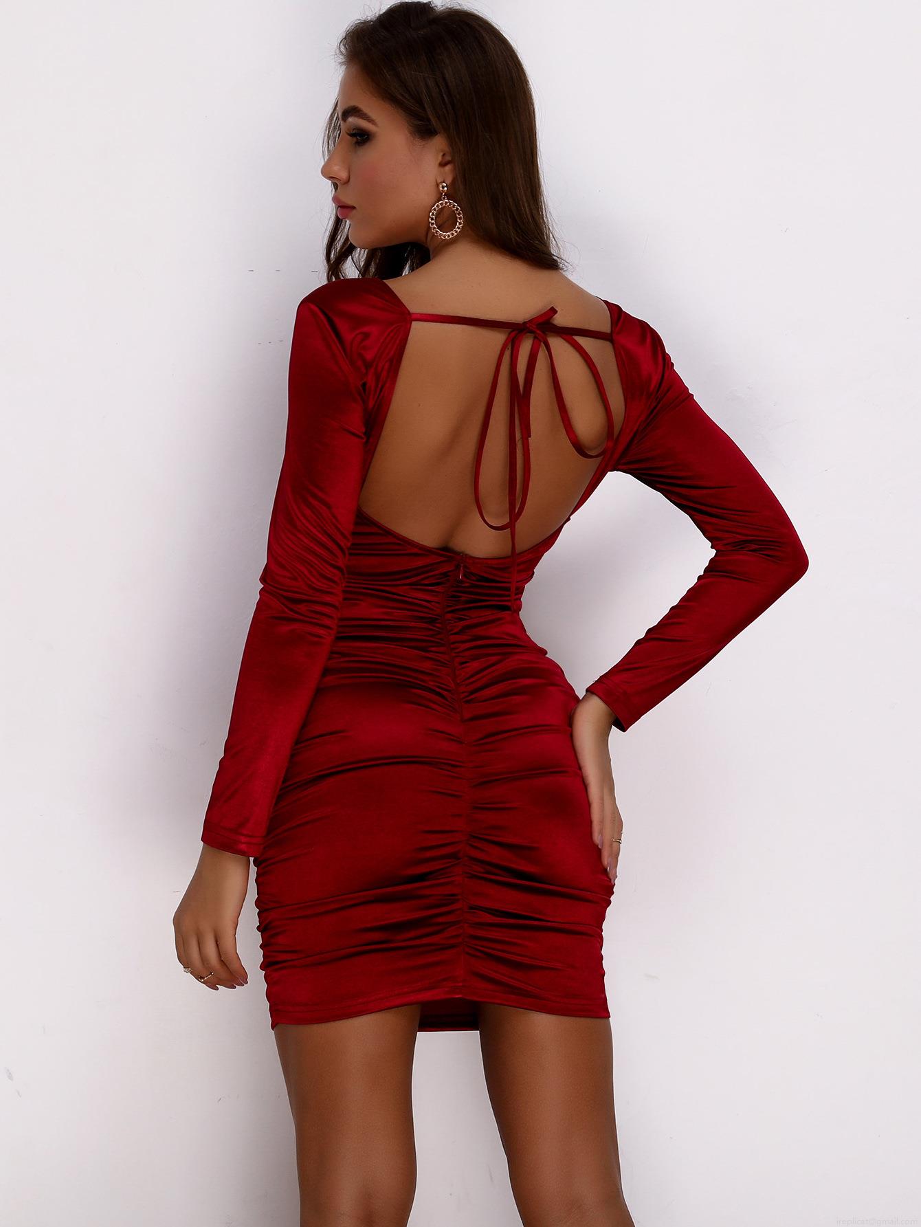 • Sexy Red Ruched Satin Mini Dress Women V Neck Long Sleeve Backless Elegant Bodycon Cocktail Party Evening Short Dress Solid Color