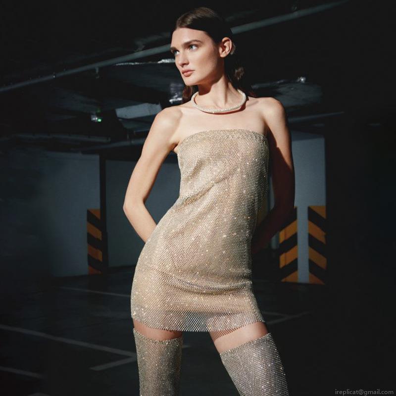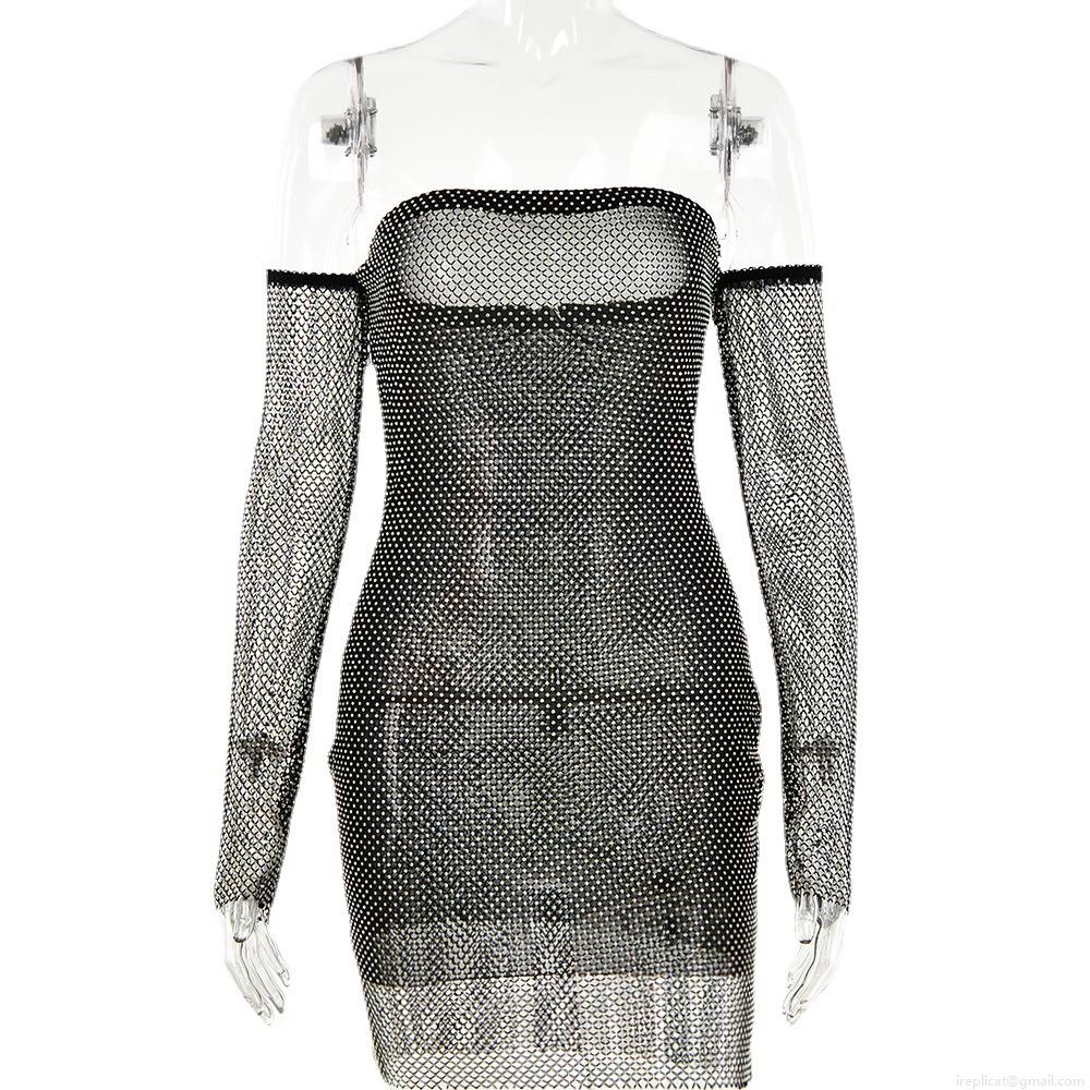 • Sexy Rhinestone Mesh See Through Mini Dress With Sleeves Long Sleeve Bodycon One Shoulder Party Nightclub Clubwear For Women Sparkly Glitter Outfit