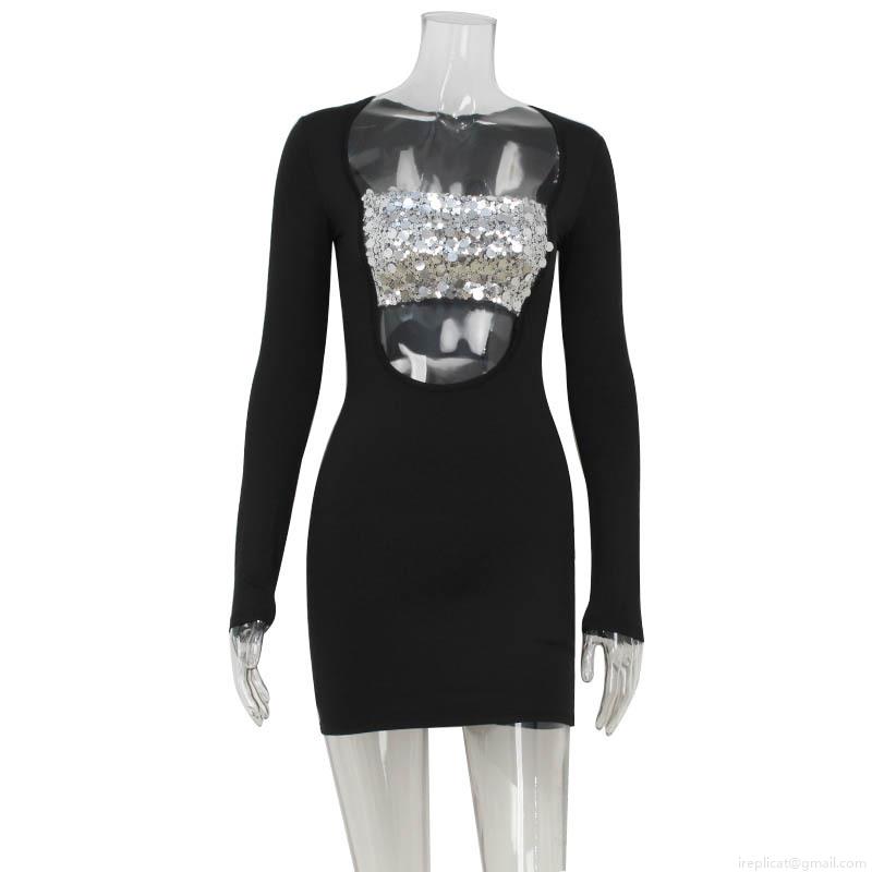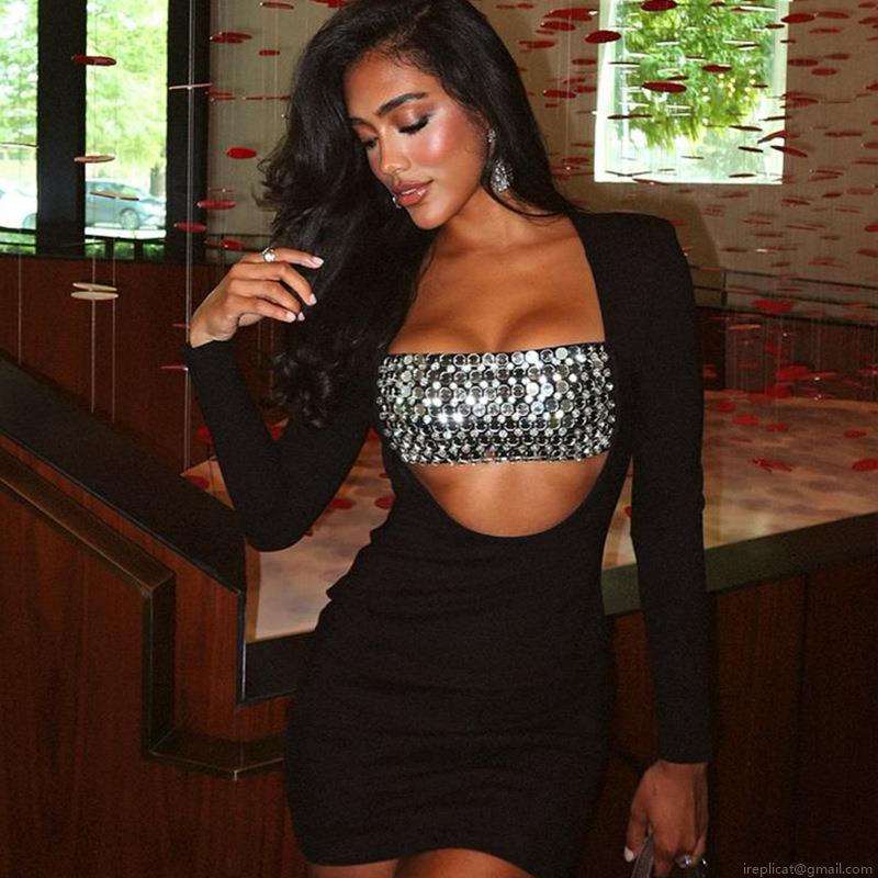 • Sexy Rhinestone Sequin Hollow Out Mini Dress Women Nightclub Party Long Sleeve Bodycon Dress High Waist Slim Fit Polyester Spandex Short Dress