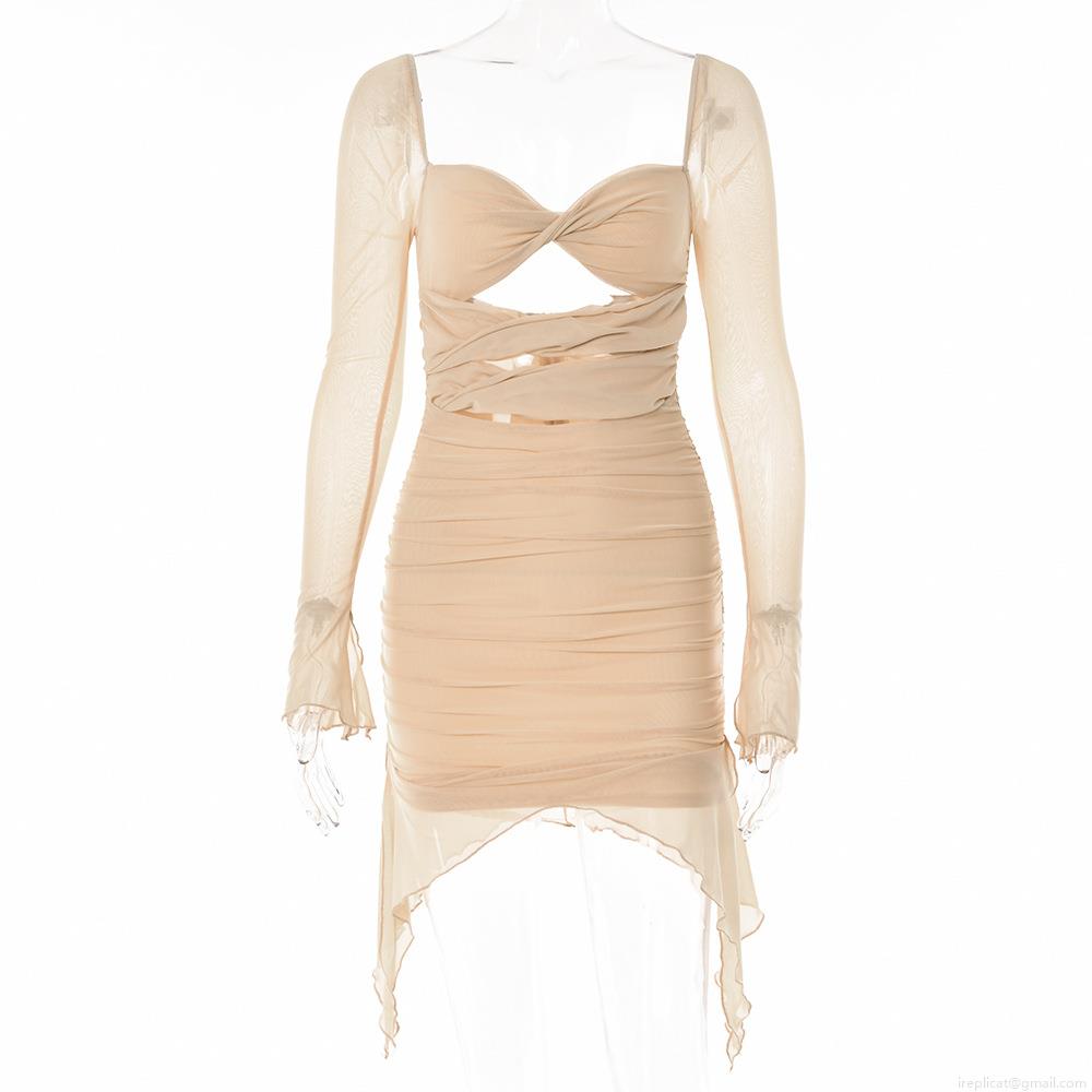 • Sexy Ruched Mesh Hollow Out Mini Dress Women Long Sleeve Square Neck Bodycon Party Clubwear Dresses With Double Layer Fabric Irregular Hem