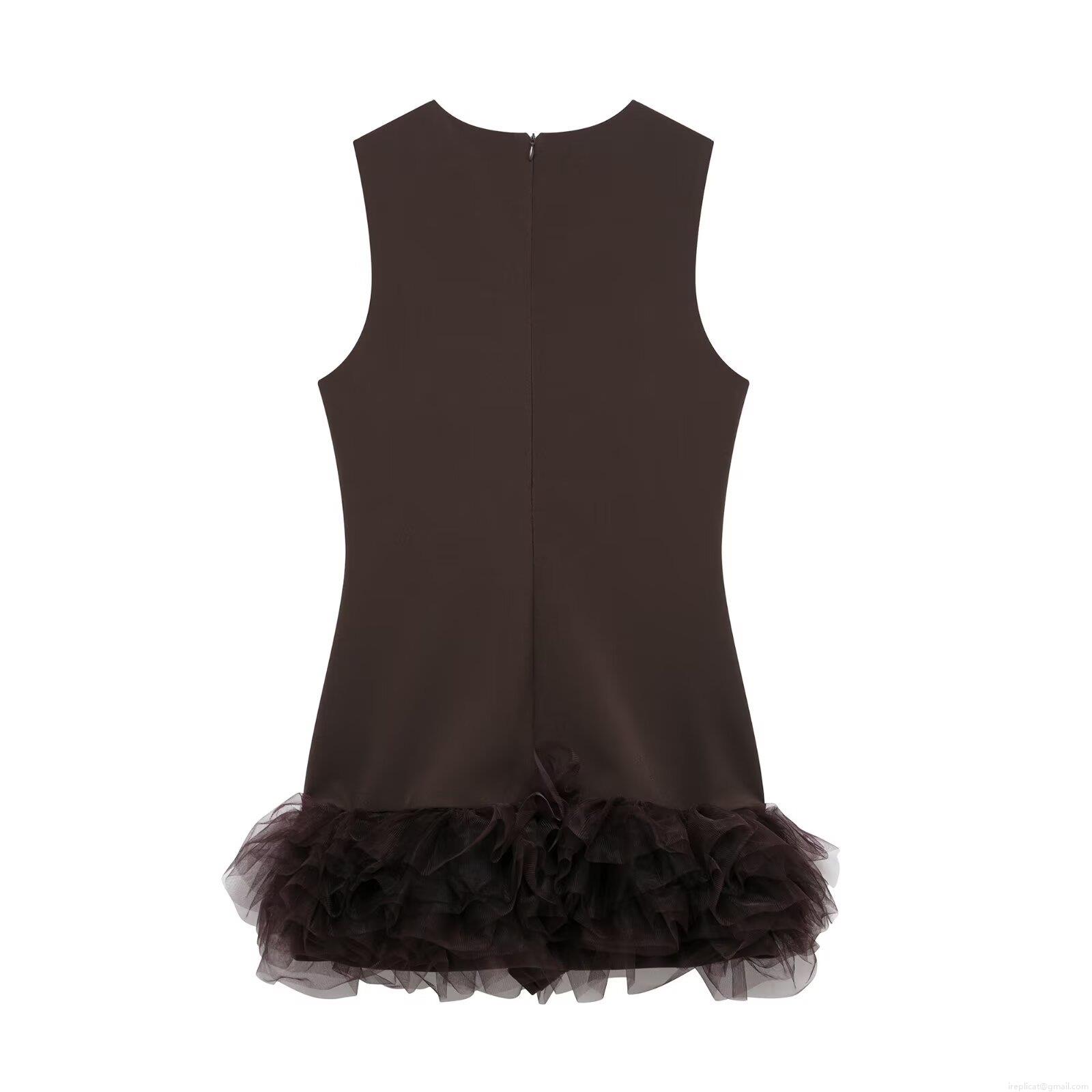 Sexy Sleeveless Mesh Layered Mini Dress Solid Coffee Brown Polyester Tulle Ruffle Bodycon Dress for Party Club Night Out Women Summer Fall Slim High Waist