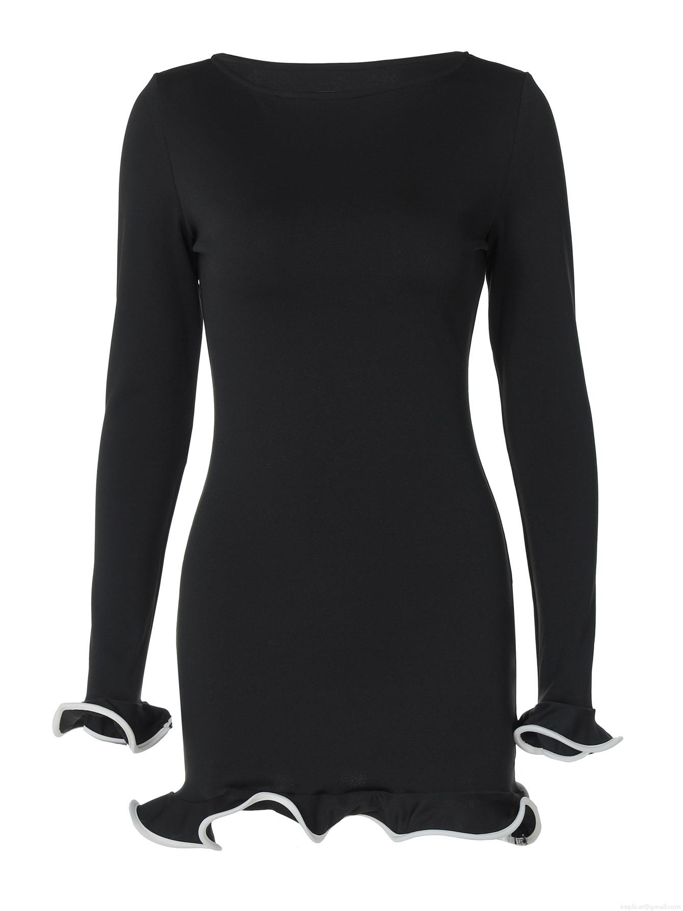 • Sexy Slim Fit Ruffle Hem Mini Dress Polyester Spandex Long Sleeve Round Neck Contrast Binding Bodycon Party Dress For Women