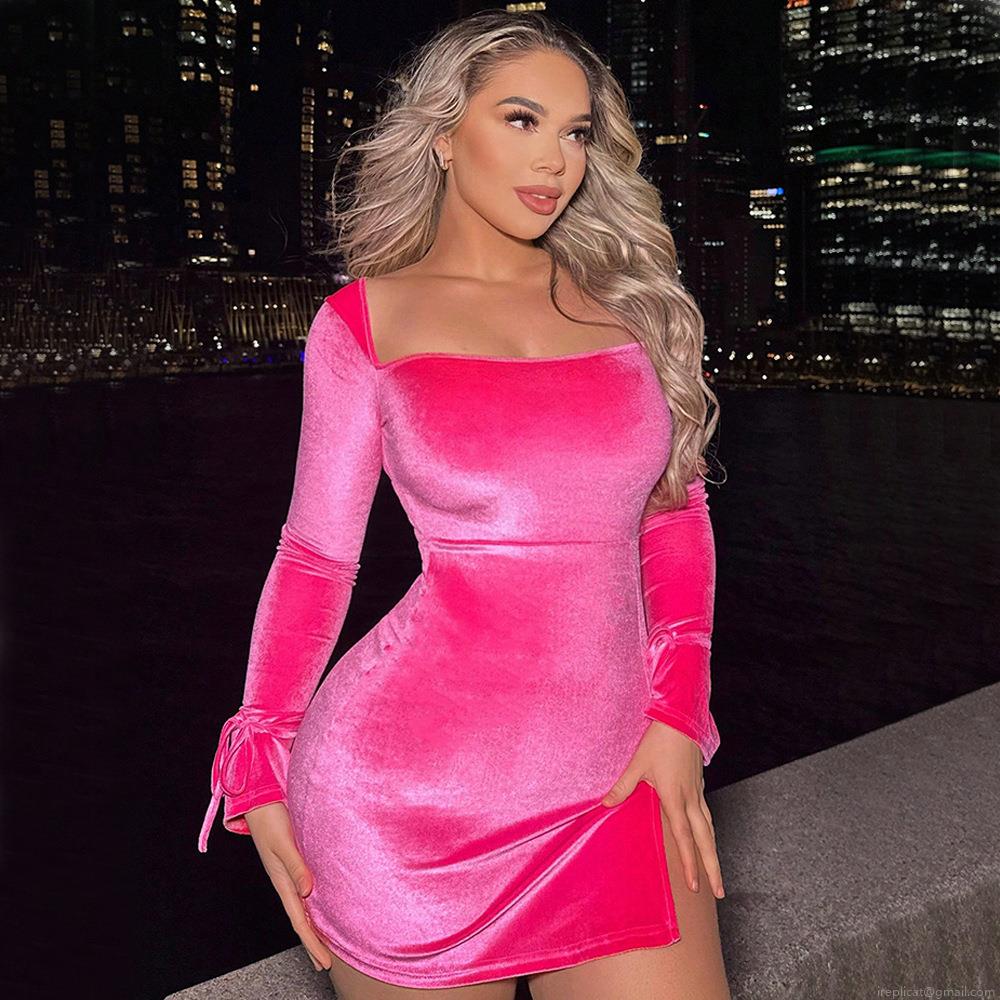 Sexy Square Neck Polyester Elastane Velvet Bodycon Mini Dress For Women Long Sleeve Side Slit Tie Cuff Party Night Out Clubwear Rose Red Skinny Short Dress