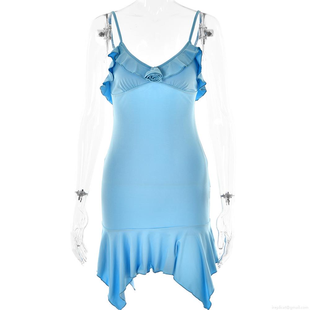 • Sexy V-Neck Ruffle Mini Dress Women Sleeveless 3D Rose Backless Bodycon Dress Summer Vacation Party Club Outfits Solid Color Irregular Hem Slip Dress