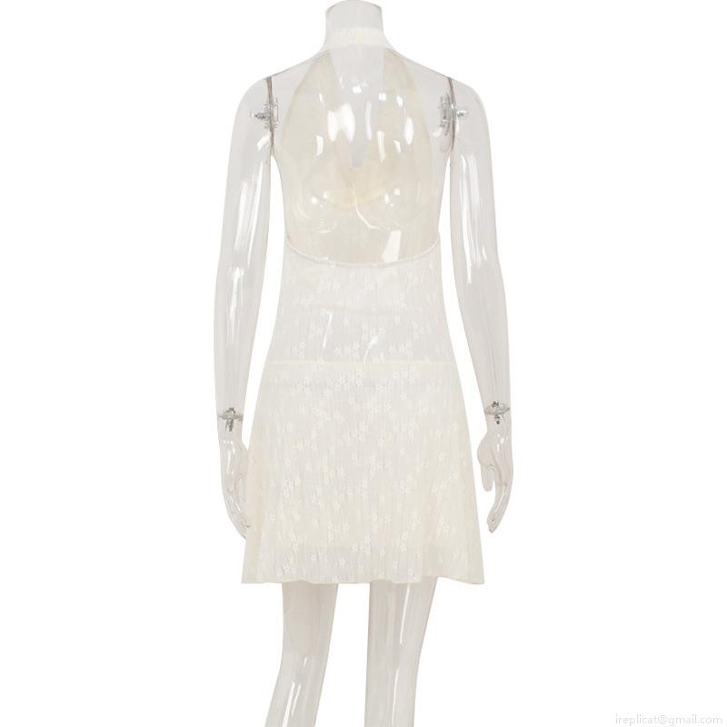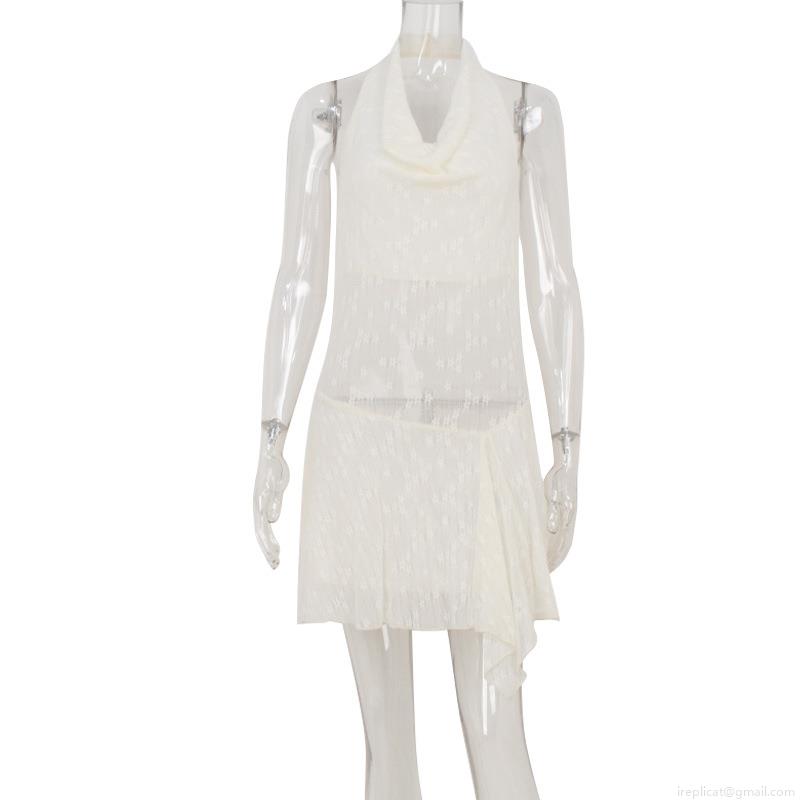 • Sexy White Halter Backless Cowl Neck Lace Mini Dress With Irregular Hem Polyester Spandex Crinkled Texture Sleeveless Party Vacation Beach Dress For Women