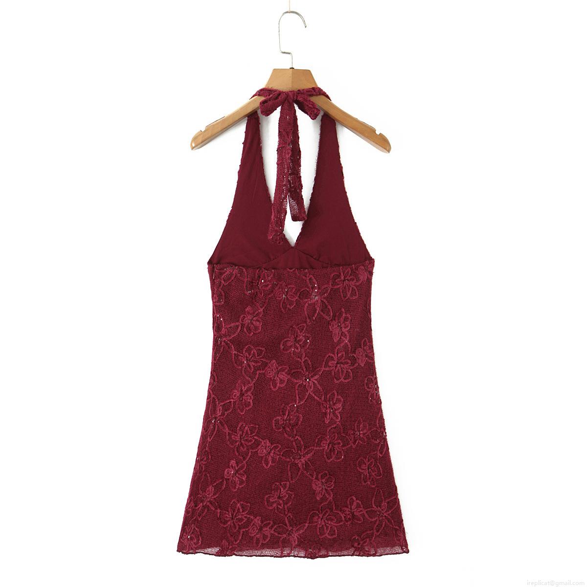 • Sexy Wine Red Halter Neck Sequin Lace Mini Dress Backless V Neck Floral Embroidered Sleeveless Cocktail Party Dress For Women Nightclub Clubwear