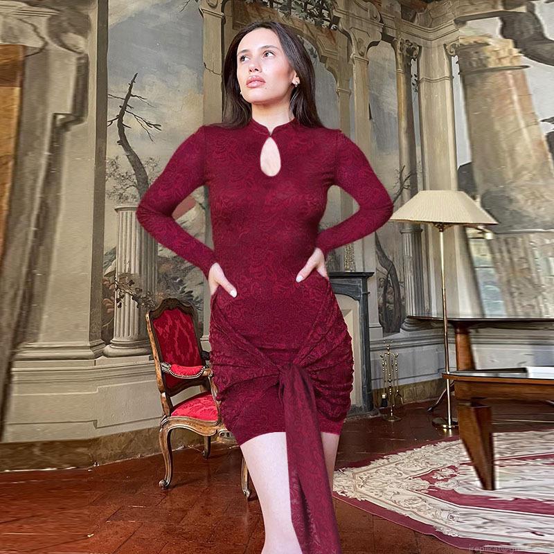 • Sexy Wine Red Lace Long Sleeve Mini Dress With Cutout Neck And Waist Twist Knot Bodycon Party Dresses For Women