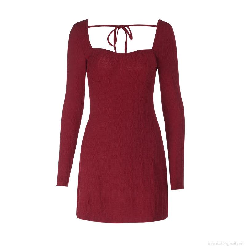 • Sexy Wine Red Ribbed Knit Backless Mini Dress Women Long Sleeve Square Neck Slim Fit Tie Back Party Club Evening Short Dress