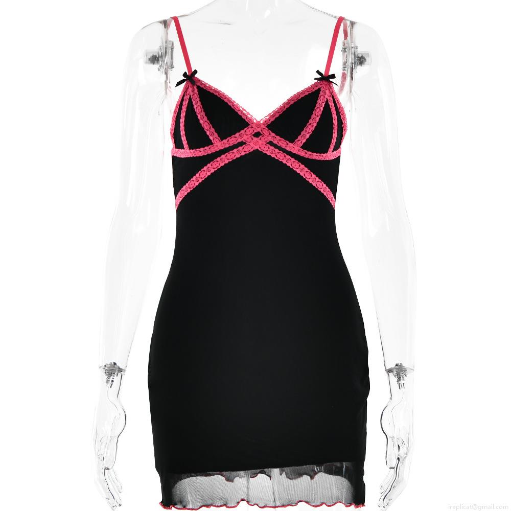 • Sexy Women Black Bodycon Mini Dress With Pink Lace Trim V-Neck Backless Sleeveless Milk Silk Mesh Patchwork Party Dress Y2K Streetwear