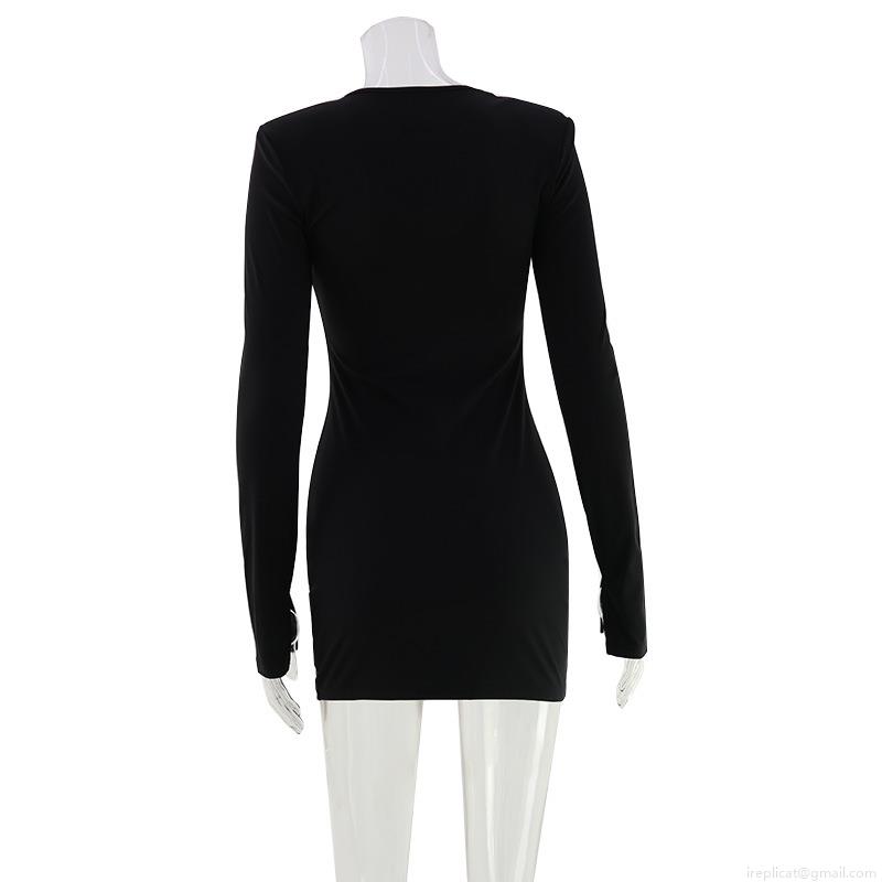Sexy Women Black Long Sleeve Bodycon Mini Dress With Metal Buckle Deep V Neck Hollow Out Shoulder Pad Tight Clubwear Party Dress