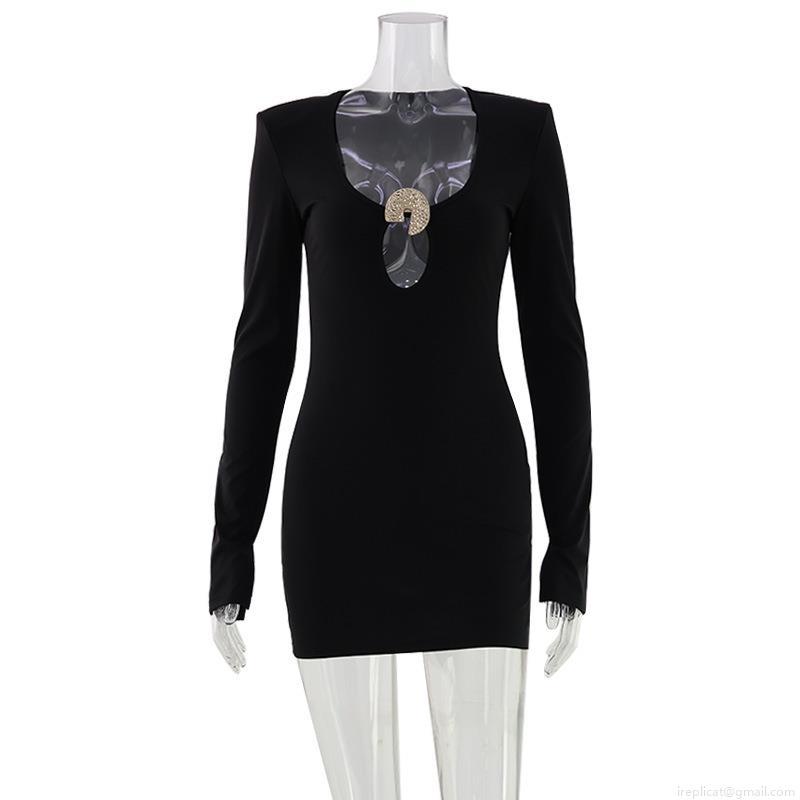 • Sexy Women Black Long Sleeve Bodycon Mini Dress With Metal Buckle Deep V Neck Hollow Out Shoulder Pad Tight Clubwear Party Dress